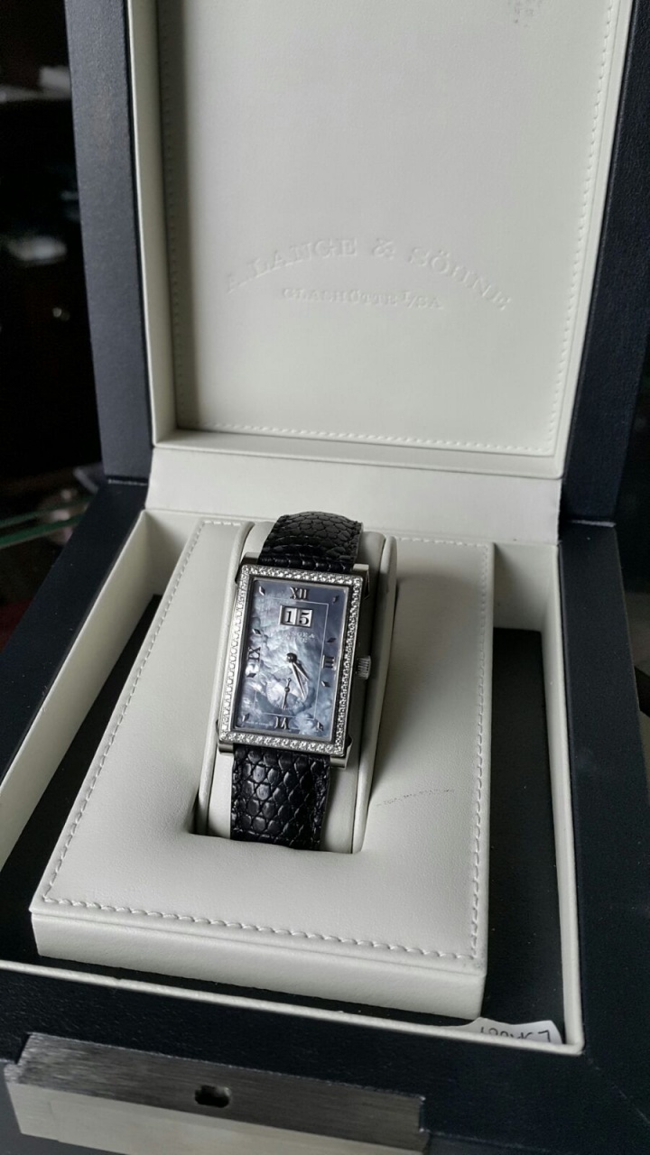 A. Lange and Sohne Cabaret ref: 827.049/LS1073UO В отличном состоянии, были получены в подарок (печать на гарантии «Кассафорте»). Лимитированная серия: 7/10. Женские. Коробка, полный комплект документов. Корпус и застежка из белого золота 18К. Бриллианты: 0,9Кarat. Перламутровый циферблат. Кожаный ремень новый, не оригинальный, ящерица. Ручной завод. Минуты, секунды, часы, большая дата. Водонепроницаемость: 30м. Сапфировое стекло. Запас хода: 42 часа. 1300000 рублей.
