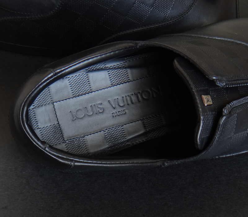 Мужские черные туфли Louis Vuitton. Полностью кожаные. Тиснение шашки Damier Infini. Спереди вместо шнурков молния. Стелька внутри тоже красивая, с тисненой шашкой. Сделаны в Италии.