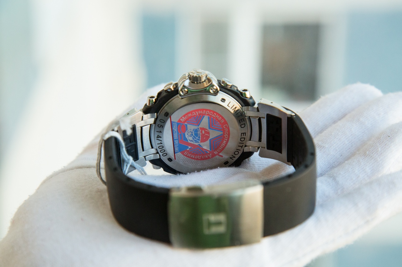 На обратной стороне часов расположена эмблема Международной спортивной академии Владислава Третьяка.