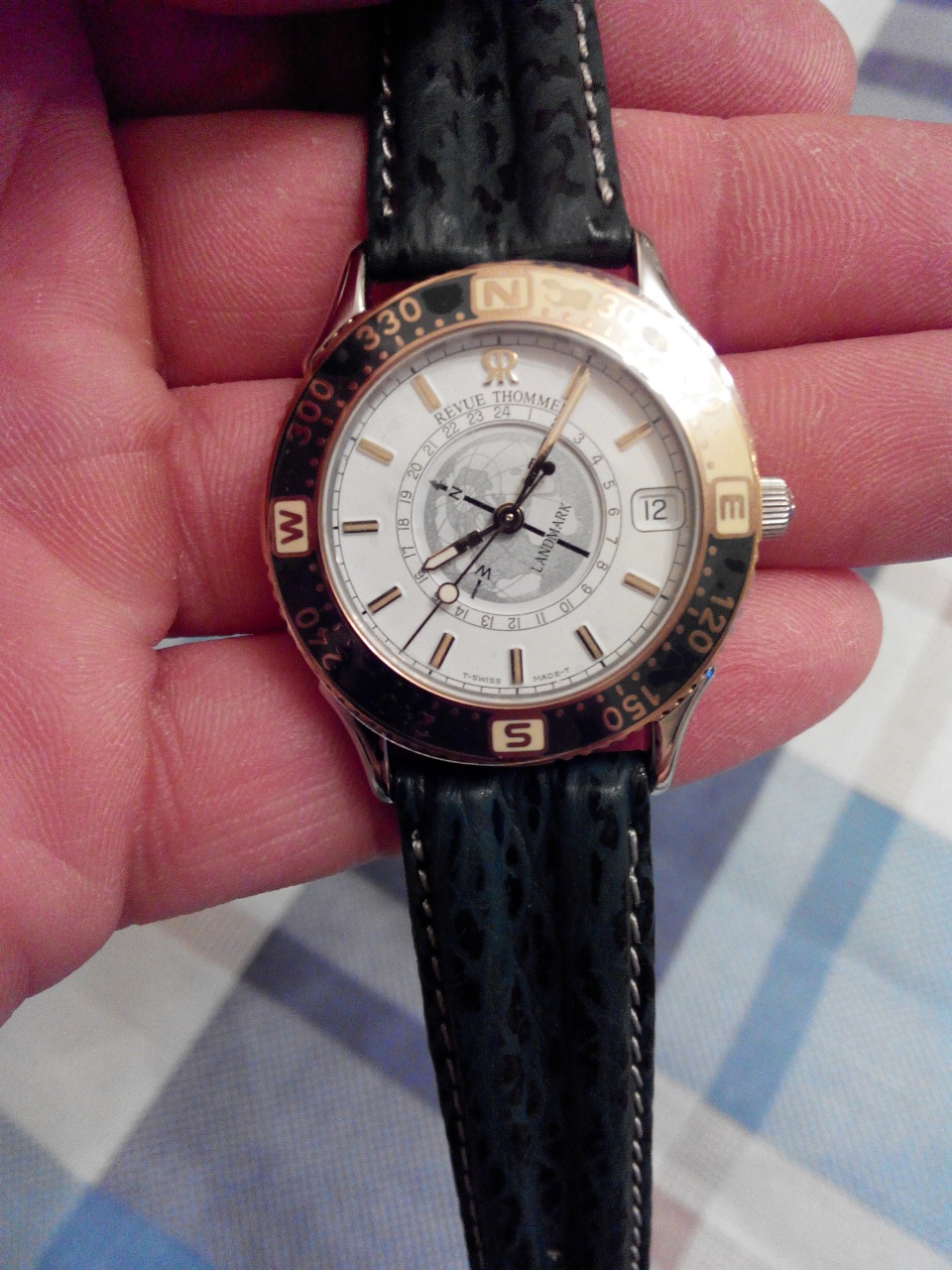 Безель - вращающийся в двух направлениях, что позволяет использовать часы в качестве солнечного компаса, сам безель промаркирован соответствующим образом. Безель двух цветов - тёмно-зелёного и кремового, цифры и риски - позолоченные.