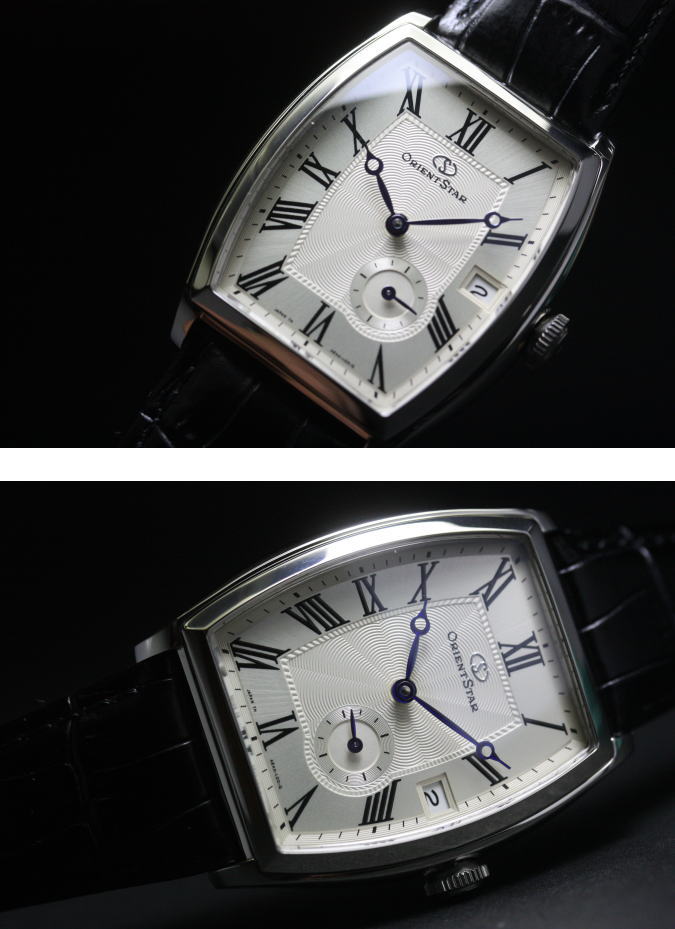 Часы получили корпус "бочка", кожаный ремень с тиснением крокодил, сапфировое стекло, элегантные часовую и минутную стрелки, вынесенную секундную стрелку между "4 и 6" часами