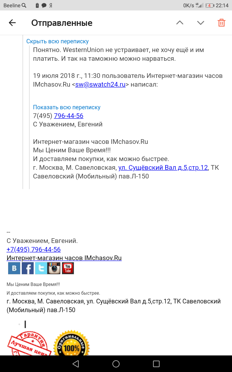 Ну и тут звонок - не, нифига, у нас часы САМЫЕ ДЕШЁВЫЕ, и они уже со скидкой, Ваш купон не действителен! Стоп стоп, вчера об этом речи не было, только о доставке! И ребят реально в гугле забанили, если они считают, что у них самые низкие цены (НЕТ). Но представитель не пробиваем и упорно твердит своё. И это из-за скидки в неполную тысячу рублей (709).