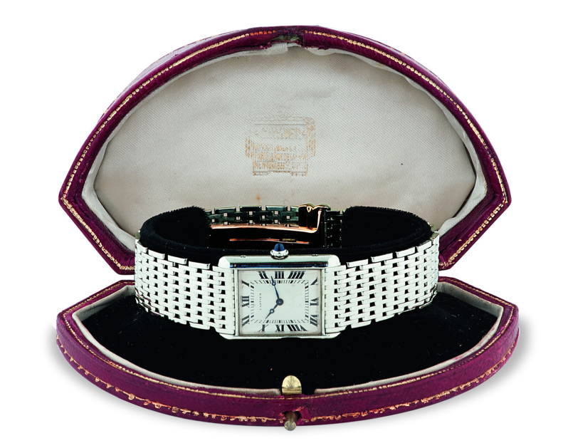 На фото: ранняя модель Cartier Tank в платине, лот 110.