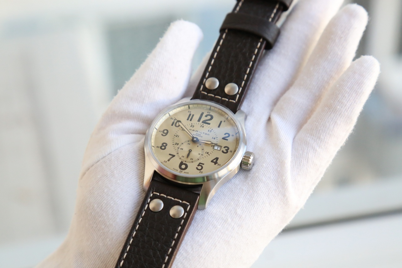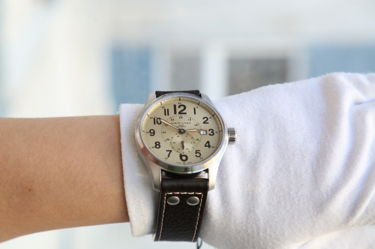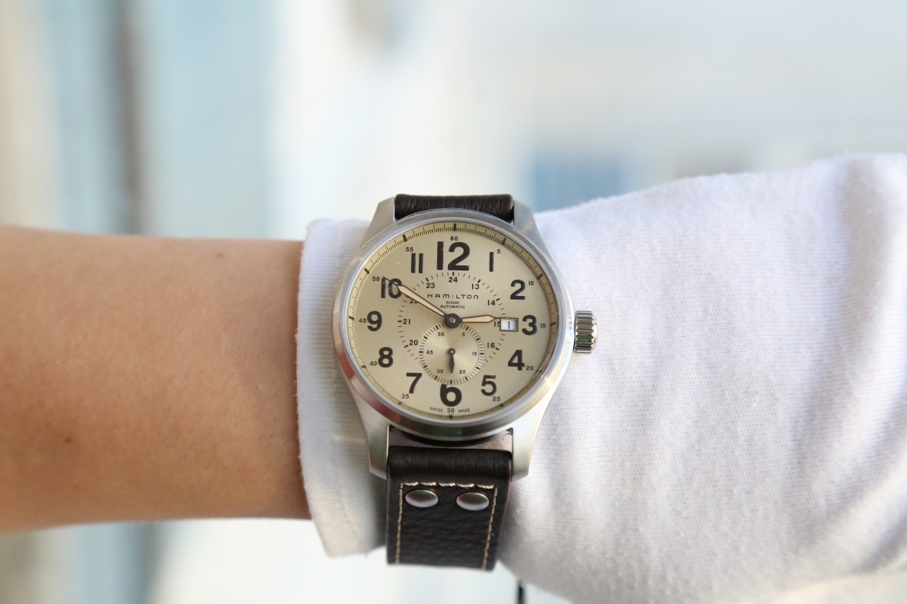 В часах Khaki Officer Auto, оснащенных механизмом с автоподзаводом, гармонично соединились брутальность линии Khaki и утонченная простота коллекции Jazzmaster. Отличительная черта – крупные цифры на циферблате – делает их идеальными командирскими часами.