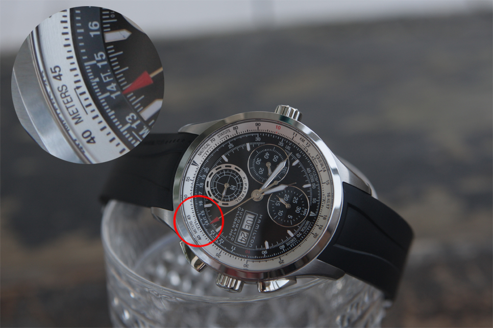 Итак “который сейчас час”. Да на циферблате много различной информации и можно сказать, что он перегружен. Но прошло меньше недели и я привык к аналоговому время исчислению, если так можно выразиться, конечно с точностью до минуты время не скажешь (минутные риски на 6, 9 и 12 часах “съели” дополнительные циферблаты хронографа). На фото ниже так же видно букву "Н" которую я ранее не видел в обзорах в обычном режиме закрыта часовой стрелкой хронографа.