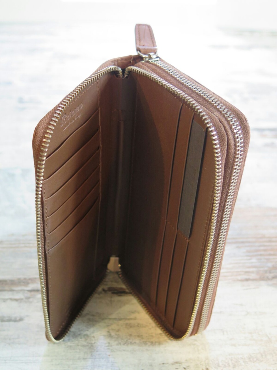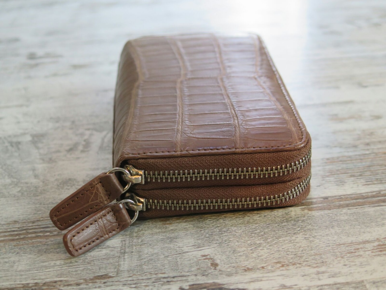 Клатч застегивается на две молнии с бегунками из кожи аллигатора и имеет три больших отделений для банкнот, 24 отделения для кредитных карт или визиток, отделения для паспорта, водительских прав, и других документов.