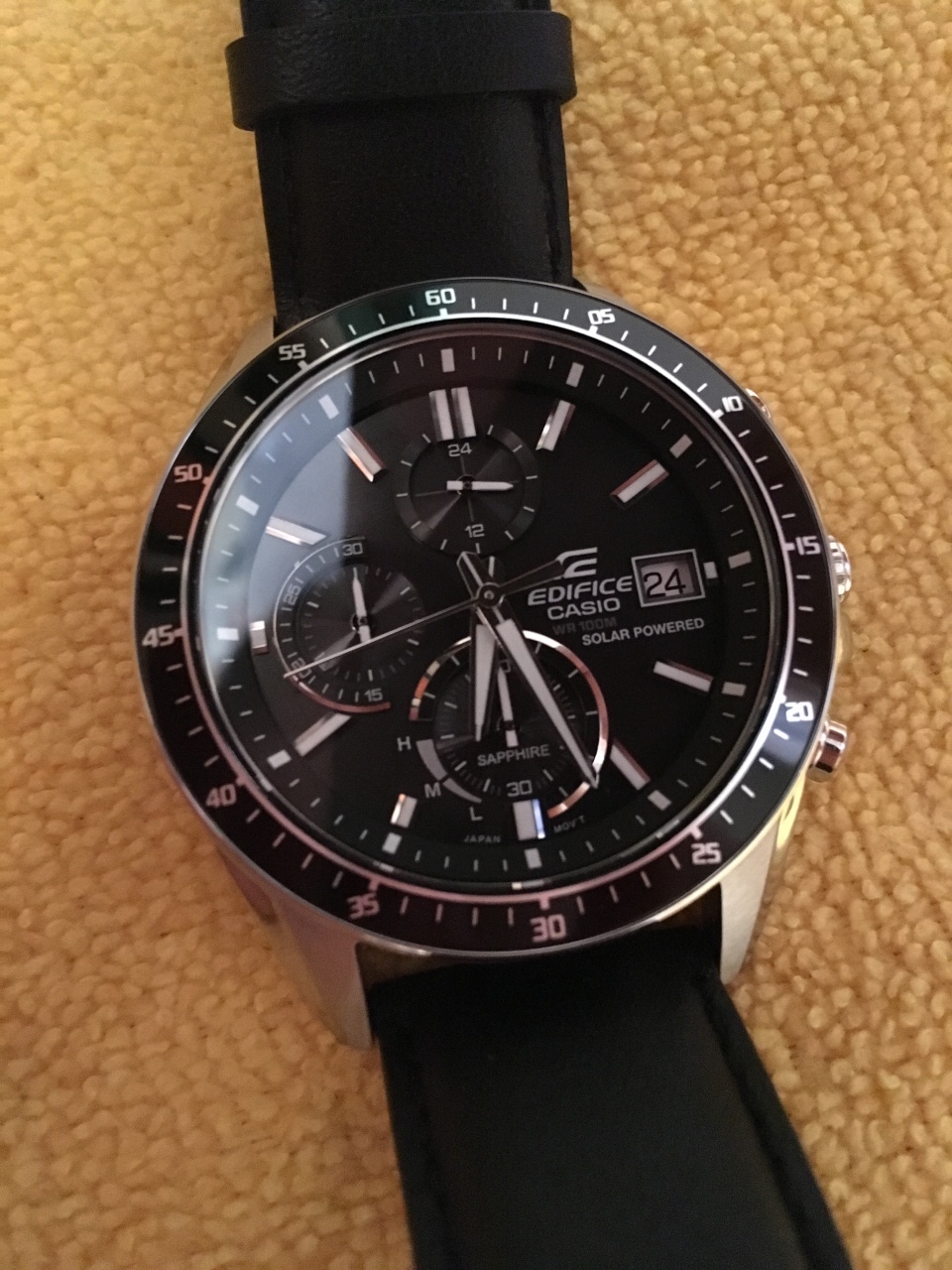 С применяемыми материалами тоже все отлично. Кожаный ремешок напомнил мне кожу Nappa на руле моей Ауди. Стальной корпус в полировке. Обод покрыт черным PVD-покрытием (похоже, что цифры и метки выгравированы на нём, поэтому беспокойства за их сохранность нет). Стекло сапфир, соответствующая надпись есть на циферблате. Редкий случай для Касио. А вот более распространённая для этих часов фишка – солнечное питание. Понимаю, что данная функция в чём-то обычный понт. Замена батарейки раз в несколько лет была бы не столь критична. Но этот понт греет душу. Осознание, что у тебя не какой-то там обычный кварц, а Solar Powered же!