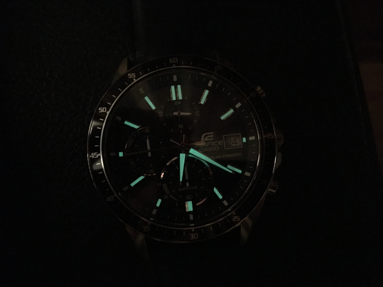 Раз уж упомянули люминофор, то особой разницы со своими Тиссо не уловил, всё те же несколько часов излучения света (но из-за больших размеров Эдифайсов люминофоровая подсветка помогает эффективнее).