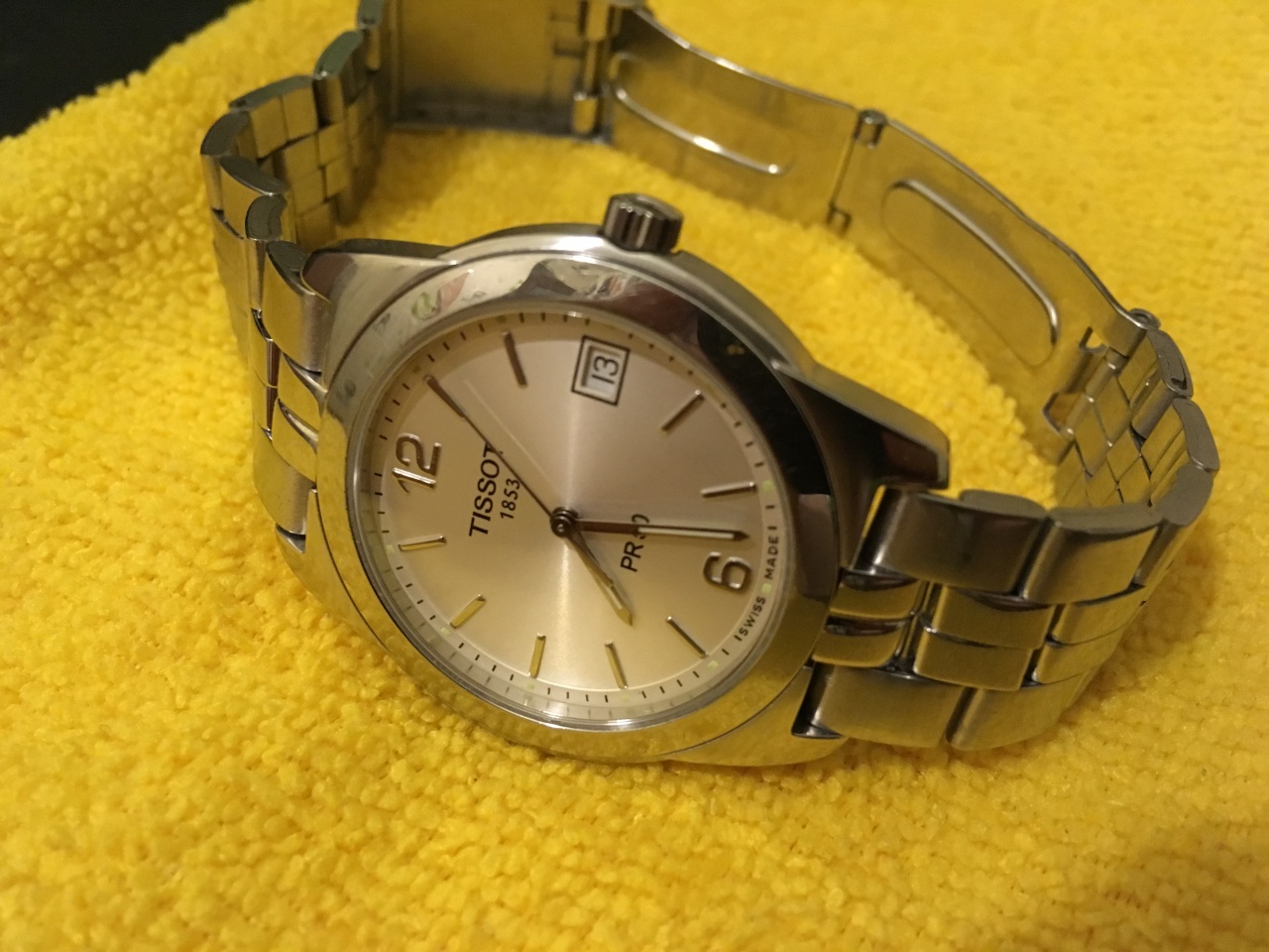 Tissot PR50 T34.1.481.32. Белый циферблат, арабские цифры на 6 и 12 часов, окошко даты на 3 часа. Стальной браслет сидел на руке идеально, выгодно отличаясь от дешевых латунных изделий. В кромешной тьме помогал ориентироваться во времени люминофор на метках и стрелках, он излучал свет несколько часов. За 12 лет на сапфировом стекле появилась только едва уловимая царапина на наружном антиблике. На стальном корпусе образовались потертости, но в целом он проявил себя очень хорошо. Кварцевый механизм ETA F06.111 за всё это время лишь два раза с помощью системы EOL давал понять, что элемент питания пора менять. При этом точность хода на сегодняшний день составляет +4сек/мес (при допуске -10..+15 сек/мес).