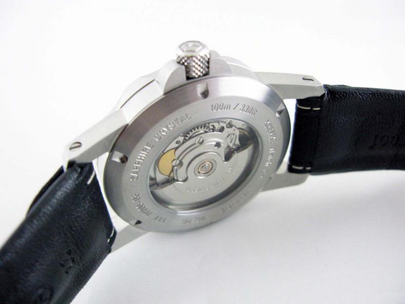 Корпус изготовлен из цельного куска высоколегированной износоустойчивой нержавеющей стали 316L, задняя крышка прозрачная (сапфировое стекло), открывающая вид на известный механизм швейцарского производства калибра ETA 2824-2
