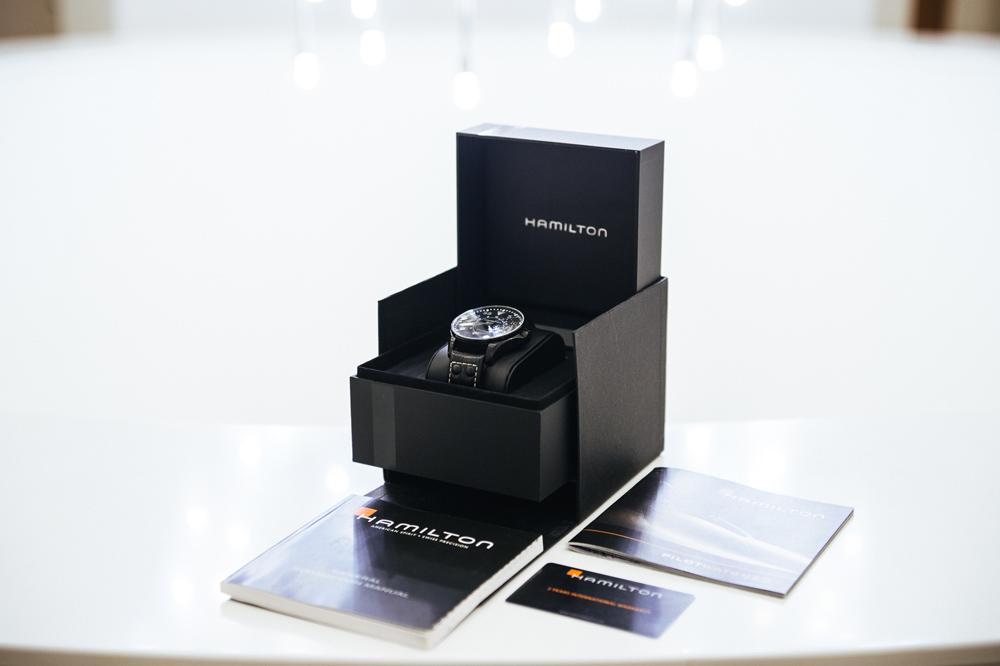 Комплект большой: часы, оригинальная коробка, инструкция, гарантийная карта, буклет с каталогом Pilot Watches от Hamilton, фирменный пакет Hamilton для пилотских часов
