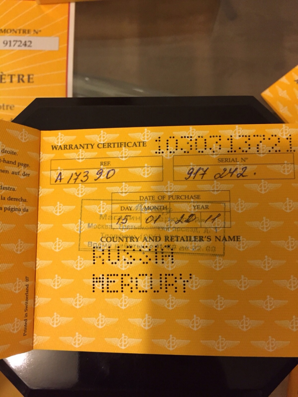 Часы были куплены на форуме в идеальном состоянии,после чего одевались не более пяти раз.Изначально были приобретены в Mercury в 2011 году,что отражено в документах.Полный комплект:коробка и документы.