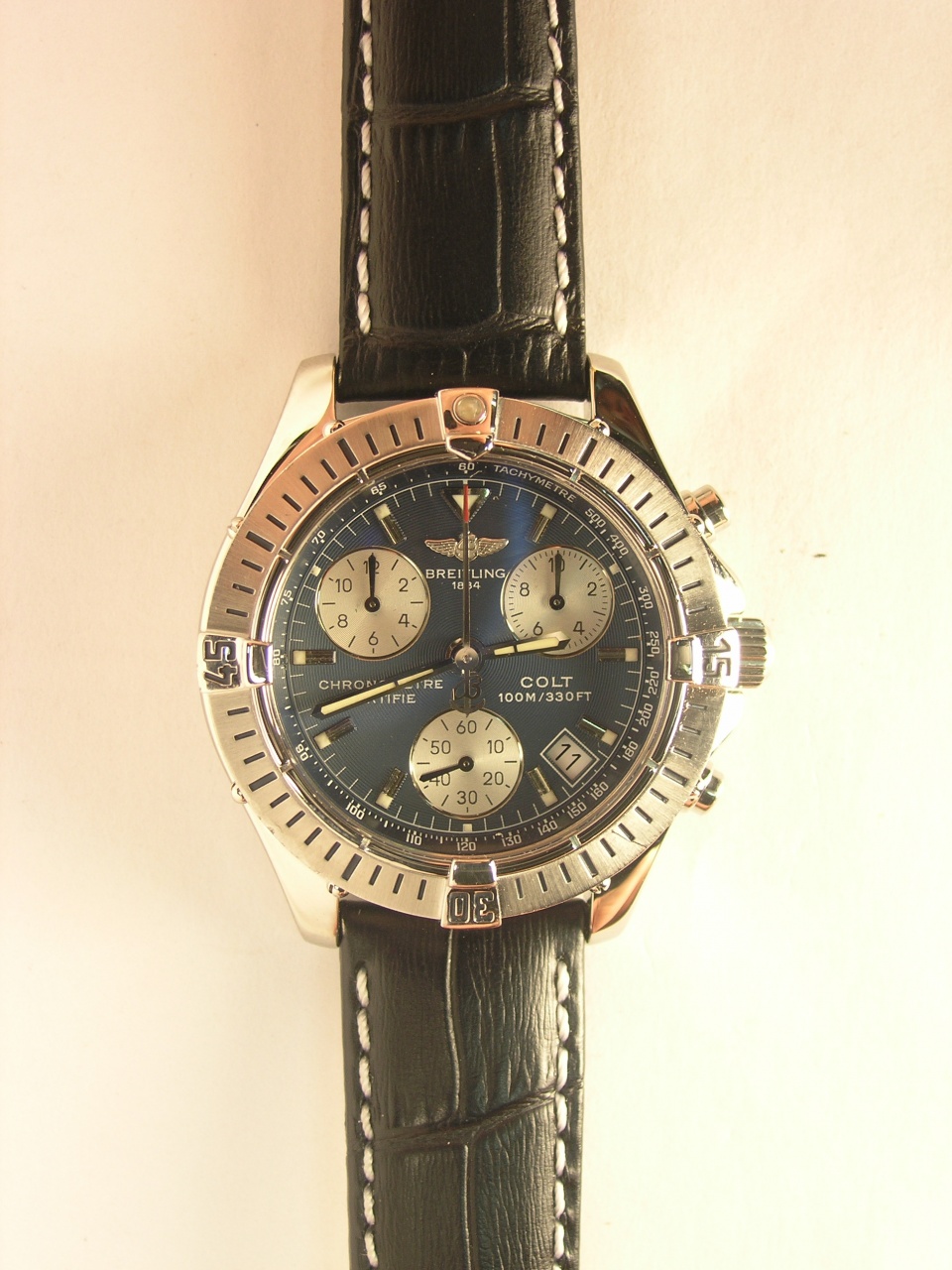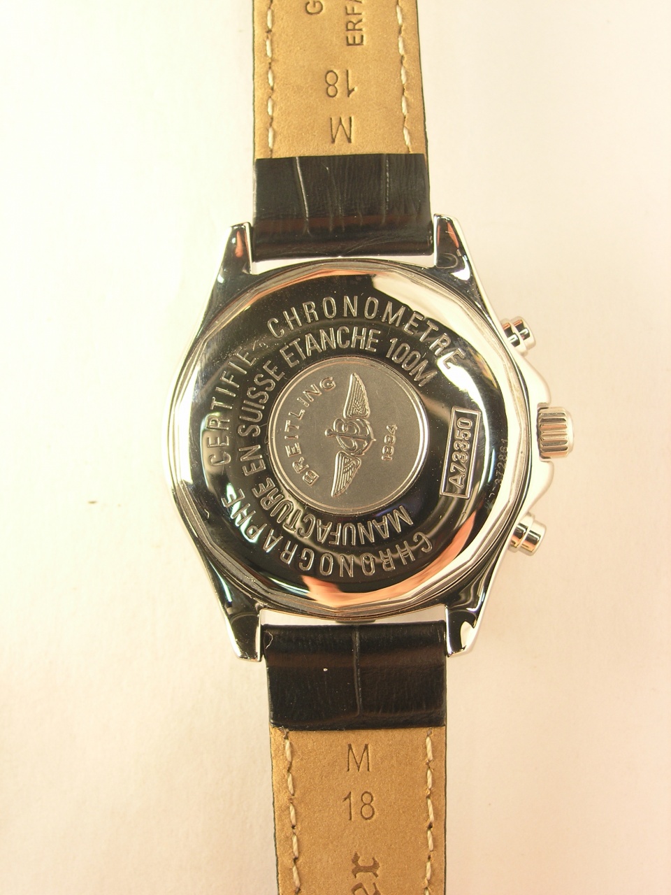 В продаже кварцевый хронограф Breitling. Корпус отполирован/сатинирован, проведено обслуживание механизма, произведена замена элемента питания. Сапфировое стекло с антибликовым покрытием. Закручивающаяся головка. Продажа в Санкт-Петербурге.