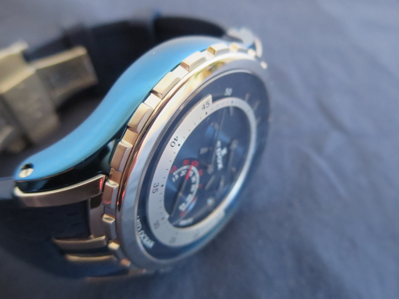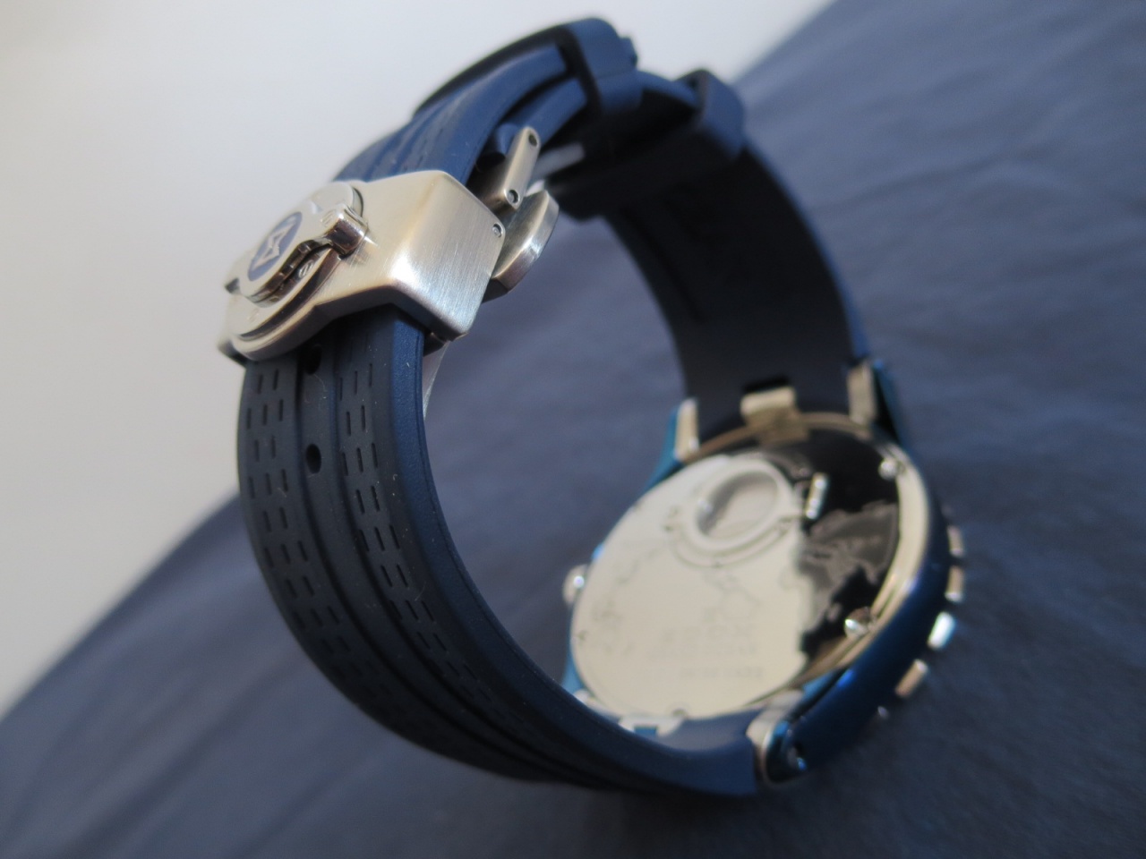 А также многоуровневый циферблат. Синий пвд на деталях, 100 метров водозащиты, окно иллюминатор просмотра механизма. И потрясающей красоты и удобства каучук