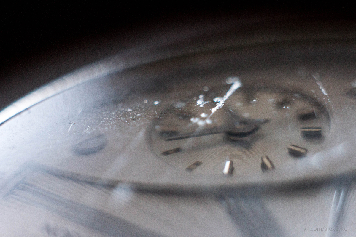 По началу в часах меня все радовало. Минеральное стекло, предполагало высокую прочность, но, когда мои часы впервые повстречались с мраморным или гранитным столбиком, я понял, что особой прочностью тут не пахнет. Я проходил мимо и случайно вскользь задел столб. Результат был сокрушительный для меня. Мало того, что стекло получило несколько царапин, отпали риски на малом циферблате и несколько точек на основном. Что делать? Решил отнести к специалистам, потому что самому лезть в тонкий механизм мешала отсутствующая врожденно покоряющая в жопе шило сила. В общем, мог попросту напортачить. А часы-то на гарантии. Ладно. Сделали. Сделали некрасиво, из под переклеенных рисок торчал клей, но со временем я забил на проблему, поскольку видел его только я. Честно скажу, не помню, до ремонта или после, но заметил, что заявленная водонипроницаемость часов - красное словцо, которым маркетологи дурят голову и заманивают клиентов. Вода в них, конечно, не заливается, но стоит им очутиться в воде или в снегу, как через некоторое время стекло покрывается испариной. Меня это жутко бесило и бесит по сей день. Приходится снимать часы и просушивать их.