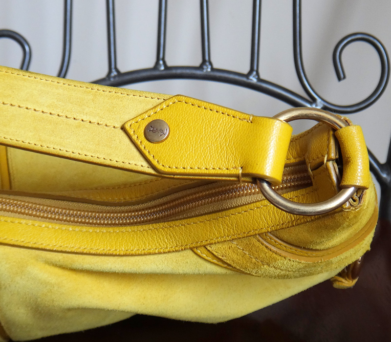 Материал: натуральная замша желтого цвета. Детали отделки - кольца и фурнитура из латуни золотистого цвета