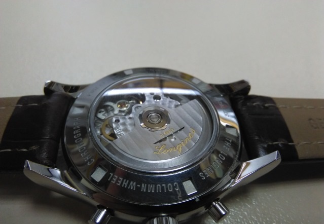 Оформление: Хронограф с колонным колесом, прозрачная задняя крышка, ремешок из кожи аллигатора, застежка пряжка