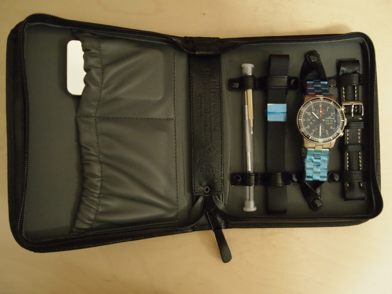 В комплекте часы, 3 ремешка, отвертка, коробочка с доп. шпильками, фирменный чехол .