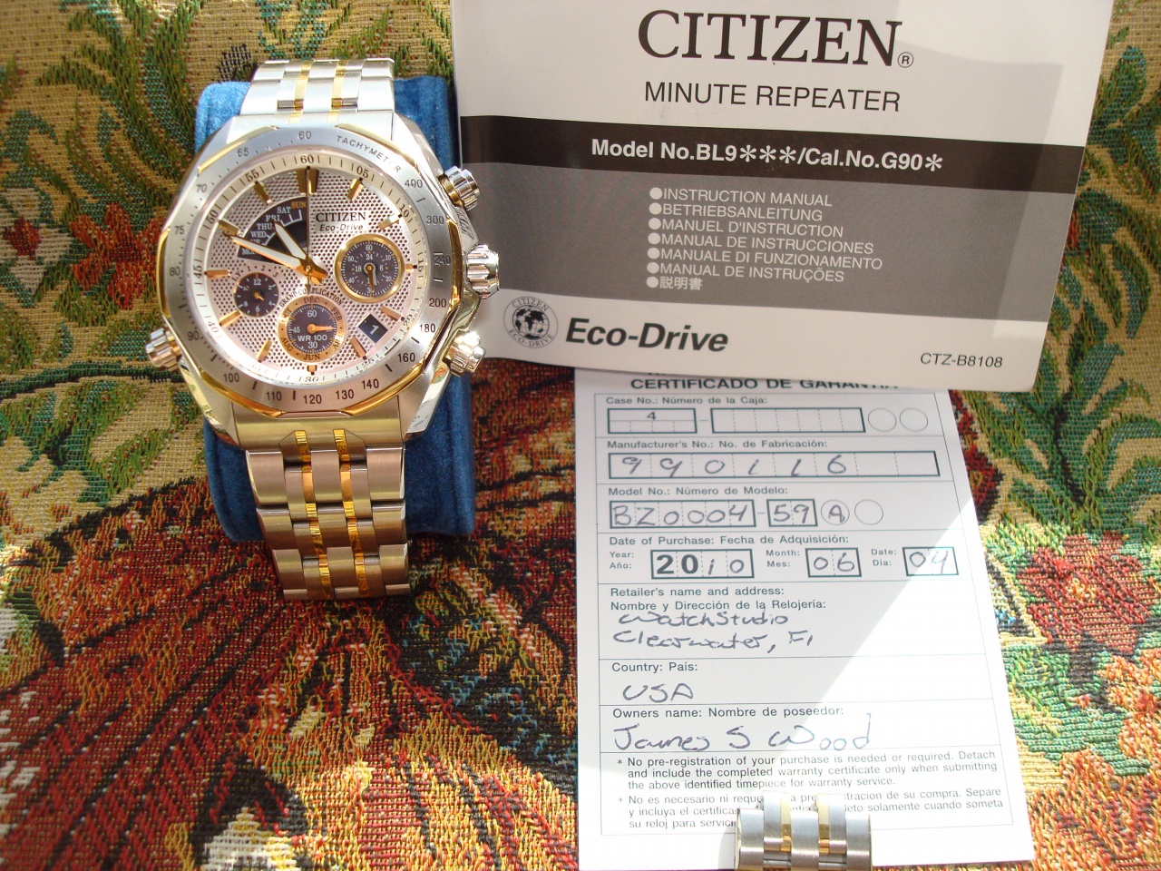 В данное время очень редкая модель даже на американском рынке. Минутный репитер ,биколор в стальной версии. Калибр G 910. Думаю модели на данном калибре особо представлять не надо: Citizen Signature- Grand Complication. Ставлю состояние АА,так как мое мнение часы соответствуют этому состоянию,готов выслушать ваши мнения. Коробки нет ! Все что прилагается к данным часам отражено на фото. Снимки сделаны в " макро " режиме,так что на самом деле царапины не так заметны. На безеле между 55 и 60 есть не большая царапина,на застежке браслета не большие царапины,звенья браслета на винтах. Стекло- сапфир,чистый без царапин. Цену ставлю 45000 рублей с моей доставкой "из рук в руки " курьерской службой. 45000 при нынешнем курсе- $ считаю по 75 рублей= 600 $. Этих денег часы стоят. Все вопросы обсуждаем в " Личных сообщениях".