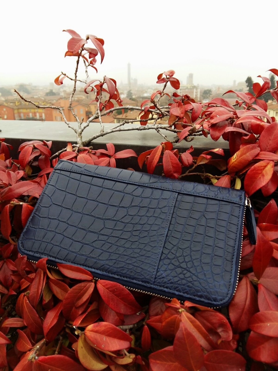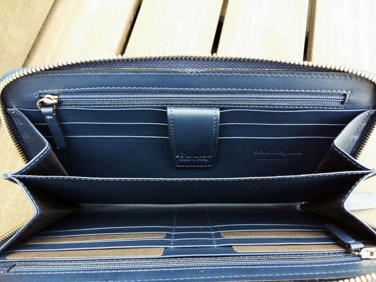 Внутри клатч отделан телячьей кожей темно-синего цвета.