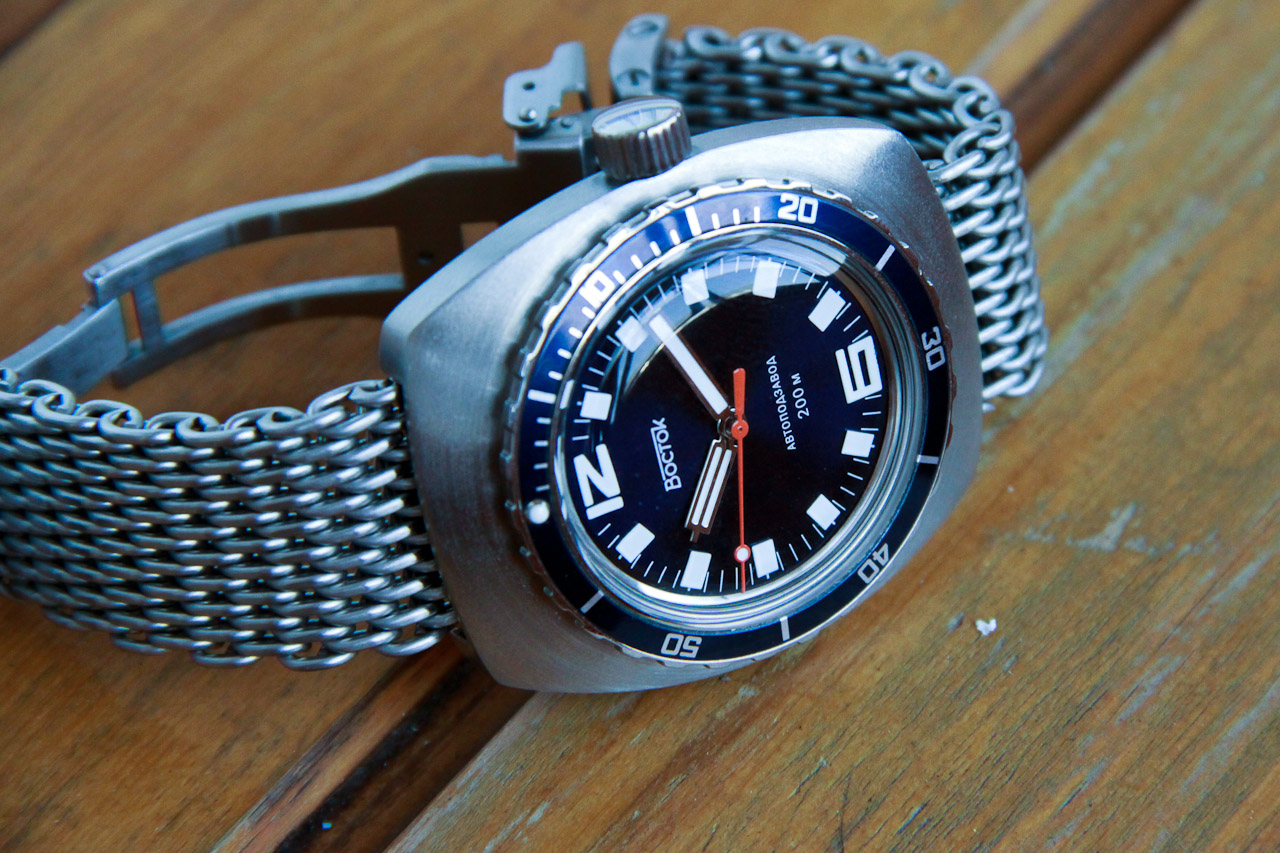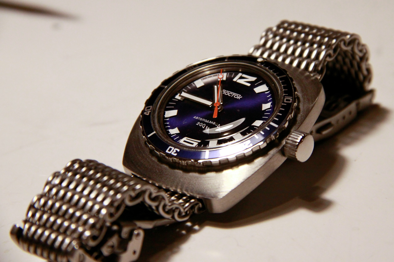 Циферблат темно-синего цвета, на свету благородно переливается, метки полностью светятся в темноте (как и у всех Востоков, не ярко)