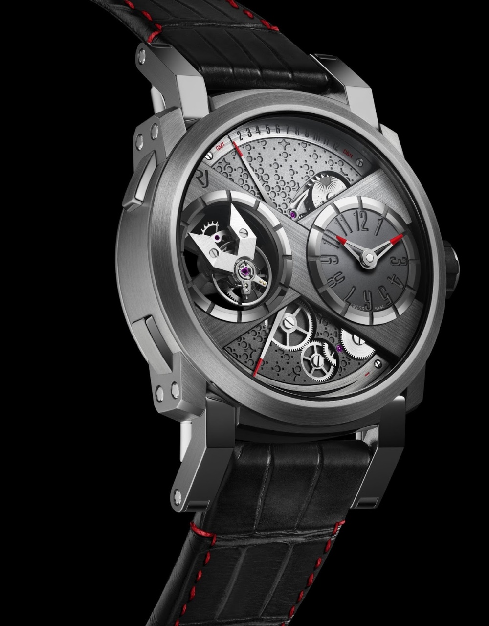 Так в положении «12 часов» появилась ретроградная стрелка, указывающая на вторую временную зону. Технически функция GMT реализована с помощью механизма jumping our. Ретроградную стрелку дополняет указатель времени суток на «2 часа» в виде диска с гравировкой солнца и звезд. Функция GMT настраивается с помощью кнопки на торце корпуса на «2 часа». Кнопки на торце круглого 48 мм корпуса визуально продолжают традиционные для циферблатов RJ-Romain Jerome полосы, пересекающиеся в литерой X. Между этими полосами, как и в оригинальной модели, свое место нашли парящий турбийон на «9 часов» и субциферблат с часовой и минутной стрелками на «3 часа». Напротив стрелки GMT расположен указатель запаса хода. Основная пластина циферблата украшена гравировкой стилизованными «звездами».