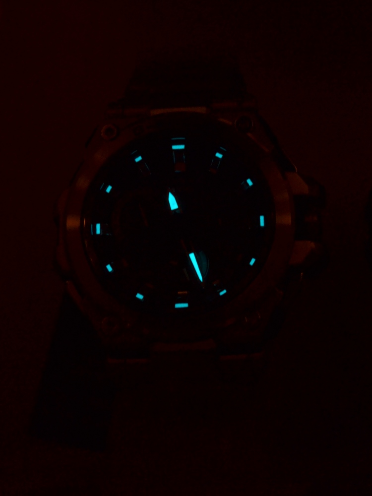 Размеры: диаметр по безелю 46 мм, со всеми выступами 54 мм, высота часов 47 мм, толщина 17 мм, вес 201 гр.