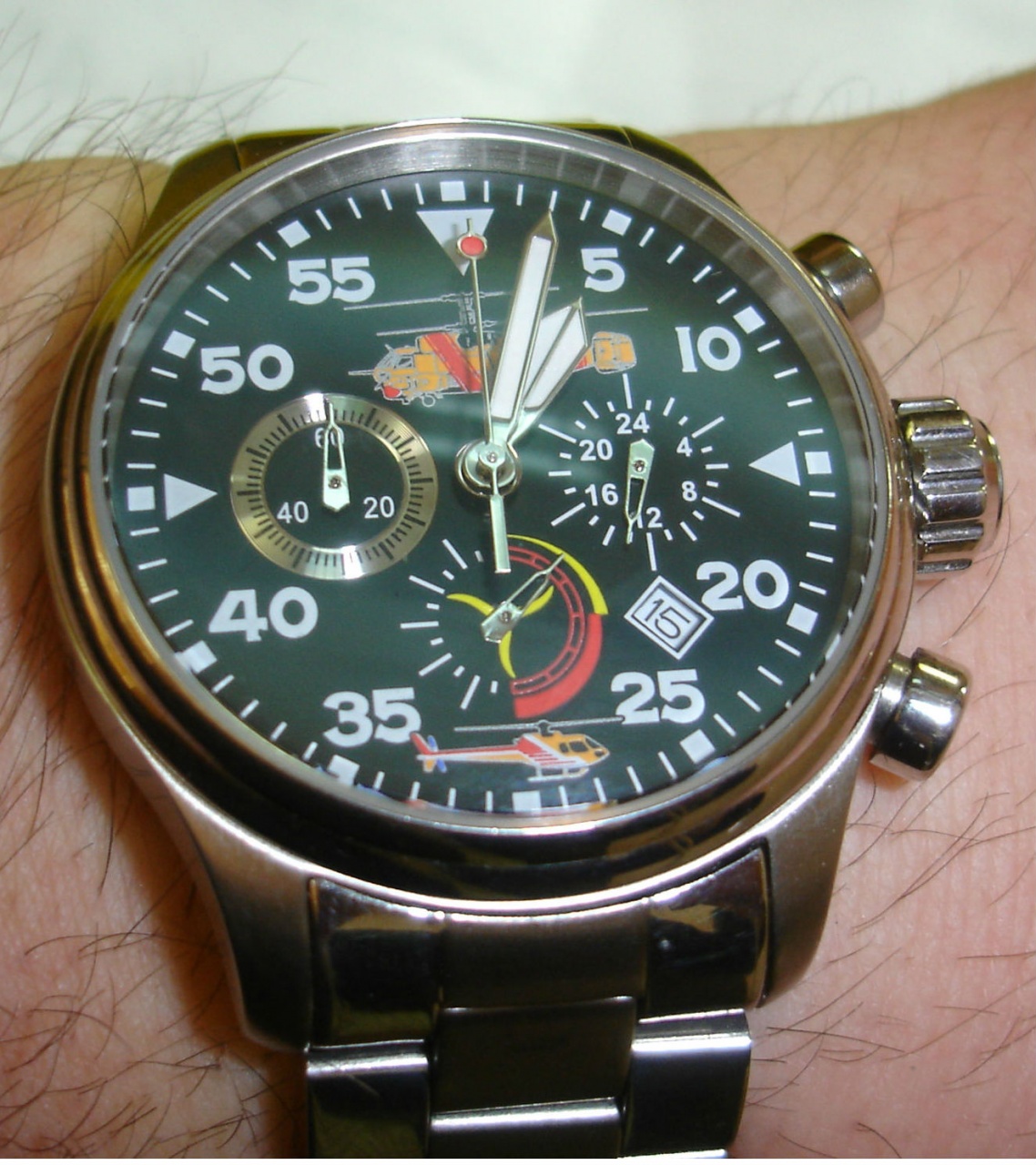 Кварцевый Хронограф с японским механизмом MIYOTA OS20 (Элемент питания SR927W), изготовленных для португальской компании EMA -авиационные средства тушения пожаров. Циферблат хронографа с авиационной символикой. На 12 часов изображён вертолёт в желто-красных цветах Ка-32 португальских ГВФ, используемых для тушения пожаров.