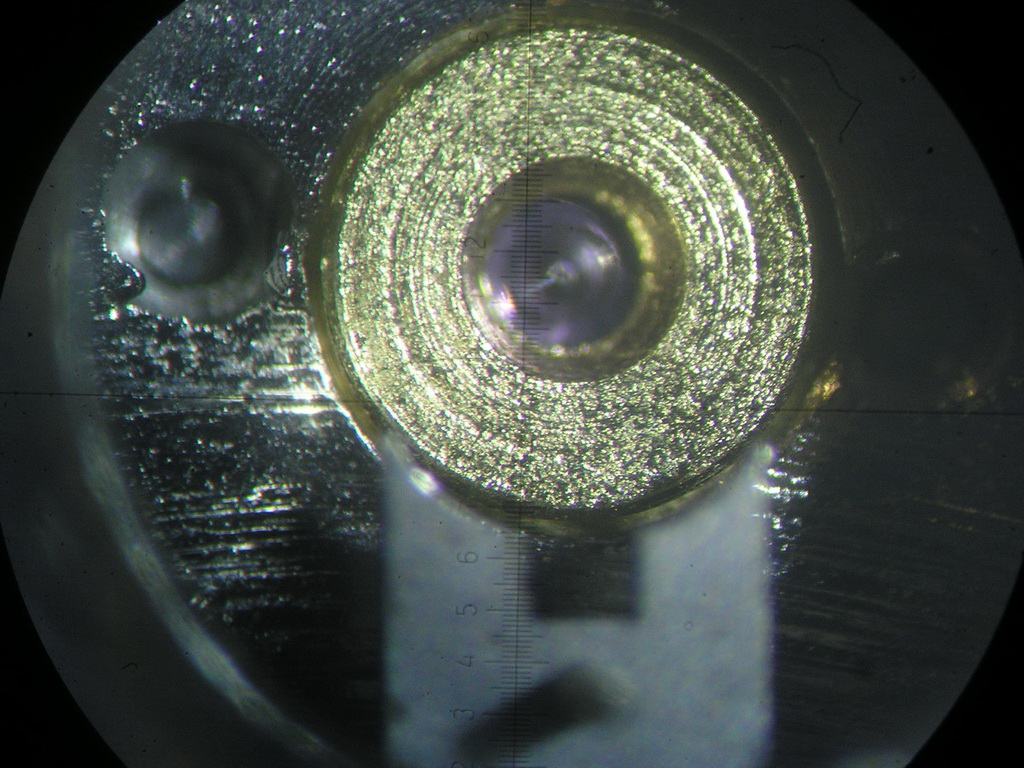 Необработанная удлиненная цапфа, для секундной стрелки, находится в высверленном отверстии оси, не точно в центре.