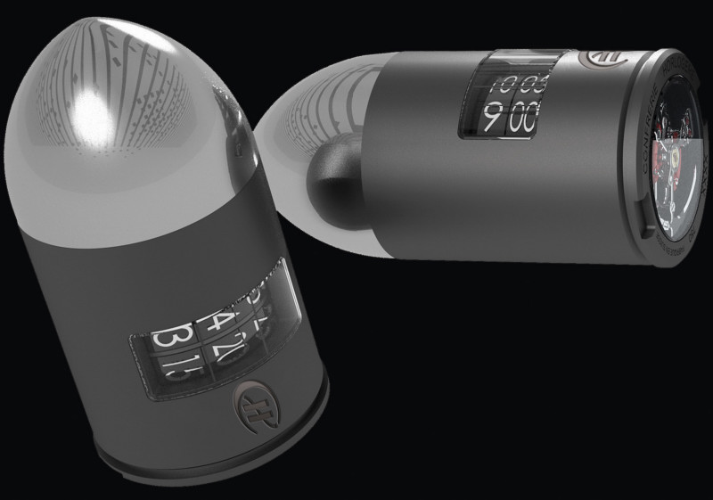 Дизайн часов выполнен в виде боевого патрона. Корпус изготовлен из полированного титанового сплава и матово-черного алюминия.