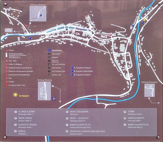 В этот момент я еще не знал наверняка, работает ли музей (хотя продавец часов в мюнхенском дьюти-фри уверяла меня, что все ок и даже рекомендовала экскурсию в Номос на выходные). К счастью, музей в этот день был открыт, но не обольщайтесь – кроме музея и парочки магазинов с часами в субботу и воскресенье вы тут не найдете. И если планируете потратить в Гласхютте целый день, то возьмите с собой какую-то еду. Кафе и бистро, любезно отмеченные на карте ALS, в выходные не работают. Единственное открытое заведение не показано на карте и располагается сразу за зданием музей. Это небольшое кафе с шаурмой и пиццой, но за неимением лучшего там можно выпить кофе и скоротать время. Принимают только наличку)
