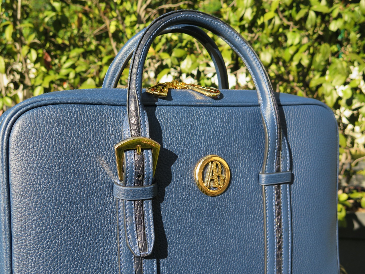 Детали и декоративные элементы сумки изготовлены из стали, покрытой позолотой. Внутренняя часть сумки изготовлена из 100% замши латиноамериканских пекари коричневого цвета, и имеет одно большое отделение для переноски документов и прочих вещей, планшетных компьютеров типа iPad или компактных ноутбуков, хранения ценных бумаг или особо важных документов, одно дополнительное отделение, и отделение, застегивающееся на молнию с позолоченным бегунком, а также кармашки для хранения 3 ручек, смартфона, визитных карточек, изготовленные из буйволиной кожи синего цвета.