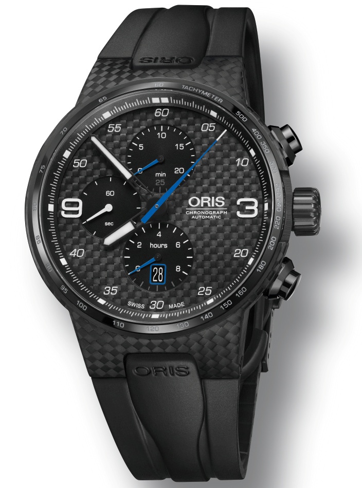 Круглый многокомпонентный корпус новинки, изготовленный из высокотехнологичного карбона, диаметром 44,0 мм, водонепроницаемый до 100 метров. Рифленая завинчивающаяся заводная головка (расположенная на 3 часах, на торце которой выгравировано наименование бренда Oris), пушеры хронографа (размещенные на 2 и 4 часах), узкий фиксированный безель (на который нанесена круглая тахиметрическая шкала) изготовлены из титана с черным DLC-покрытием. Задняя крышка часового корпуса глухая завинчивающаяся, на ней выгравированы имя и номер Valtteri Bottas, а также номер экземпляра в лимитированной серии. Сапфировое стекло с внутренним антибликовым покрытием защищает циферблат из черного карбонового волокна, с накладными арабскими цифрами и часовыми индексами, покрытыми, как и черные часовая и минутная стрелки, люминесцентным составом SuperLuminova белого цвета. Стрелки хронографа - синего цвета.