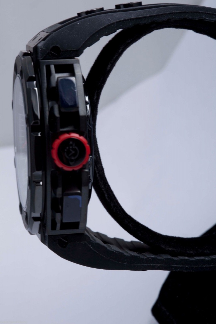 Красный циферблат с красными стрелками и часовыми индексами. Минутные метки вокруг внешнего обода.