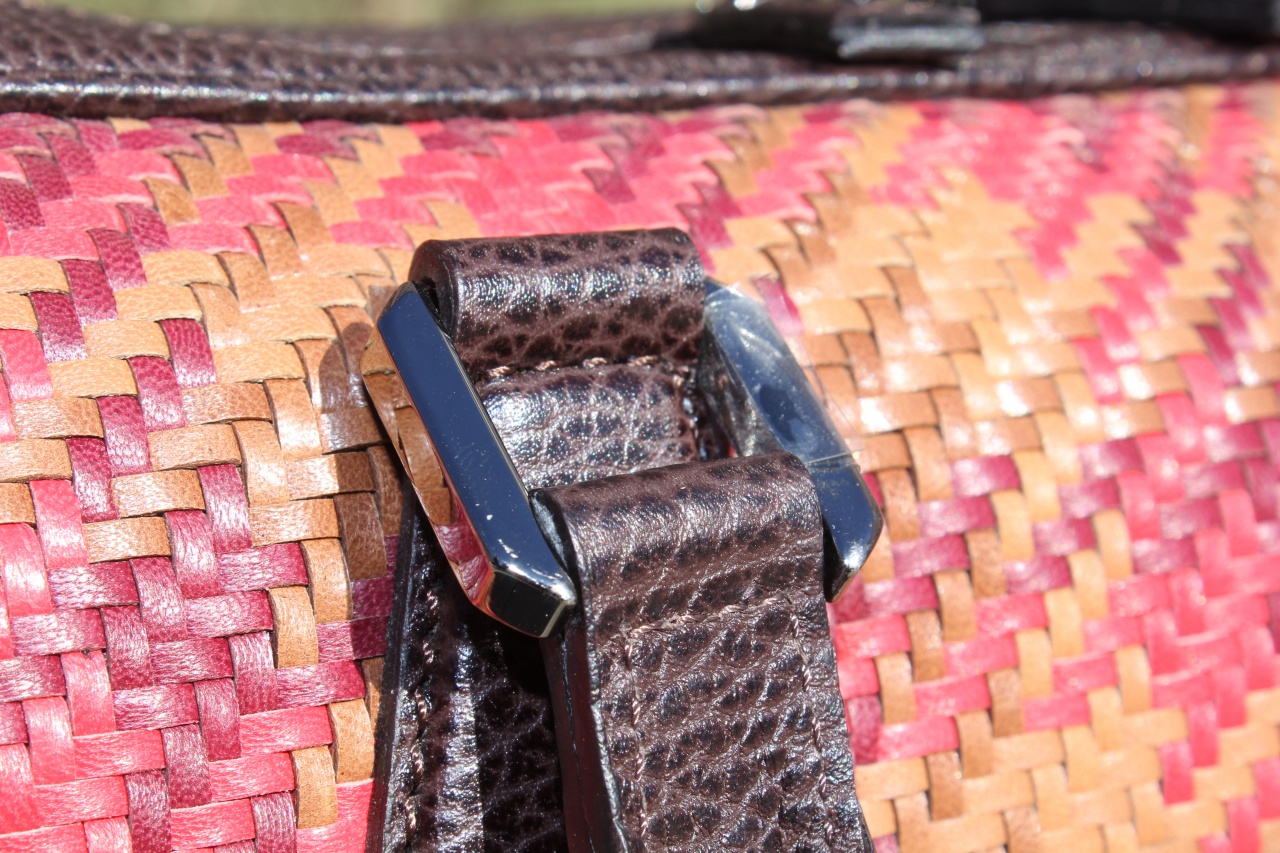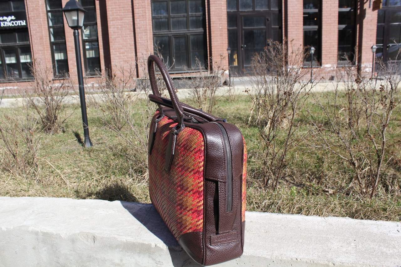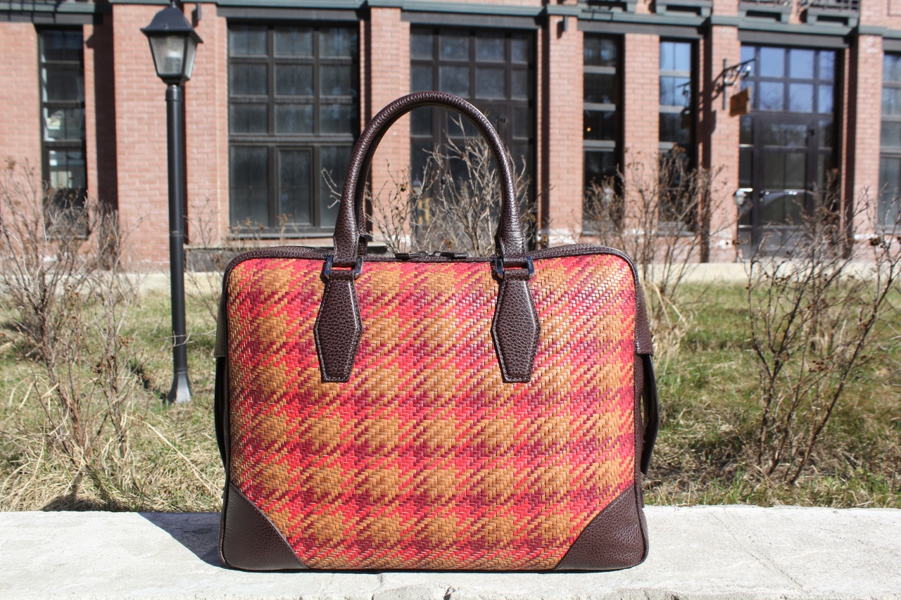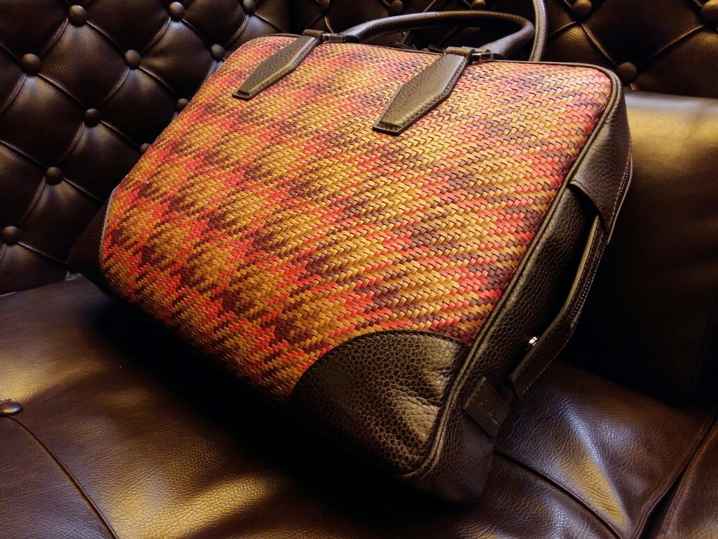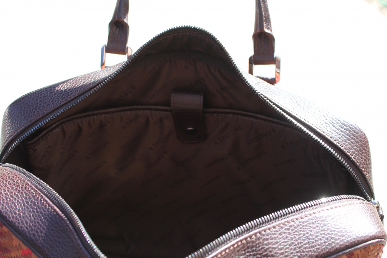 Сумка изготовлена из 100% комбинированной телячьей кожи тёмно-коричневого цвета и плетенной по старинной итальянской технологии, разноцветной кожи (итал. "intrecciato") с рисунком в английском стиле.