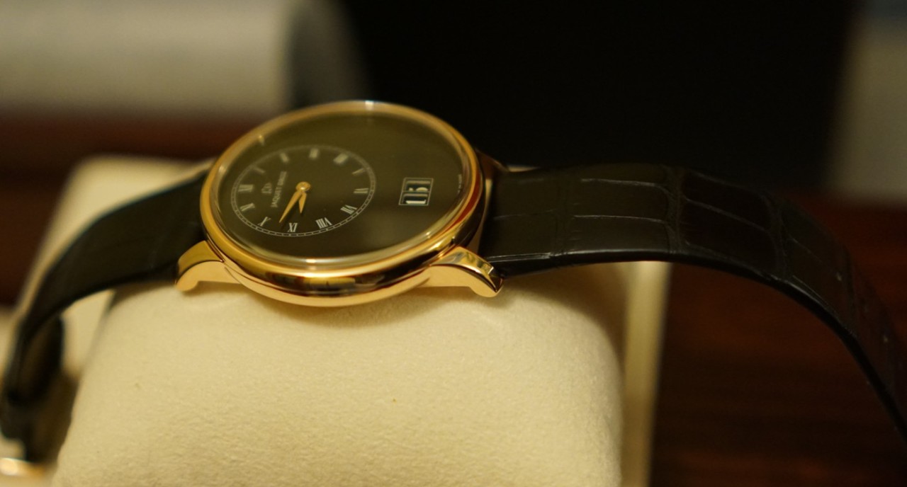 Часы Jaquet Droz Magestic Beijing Grande Date J016933210 обладают круглым корпусом из 18-каратного розового золота, диаметром 43мм, водонепроницаемостью до 30 м. Рифленая заводная головка расположена на отметке 3 часа. Сапфировое стекло установлено на передней стороне часового корпуса (с антибликовым покрытием) и на его завинчивающейся задней крышке. Циферблат черного цвета со стрелками золотистого цвета. Модель оснащена мануфактурным швейцарским автоматическим механизмом. Калибр Jaquet Droz 2653G с 65-часовым запасом хода, функциями индикации часов, минут и увеличенной даты (посредством апертуры на отметке 6 часов). Калибр отменно отделан и декорирован. Поставляется на ремешке из кожи аллигатора с вставкой из 18-каратного розового золота.