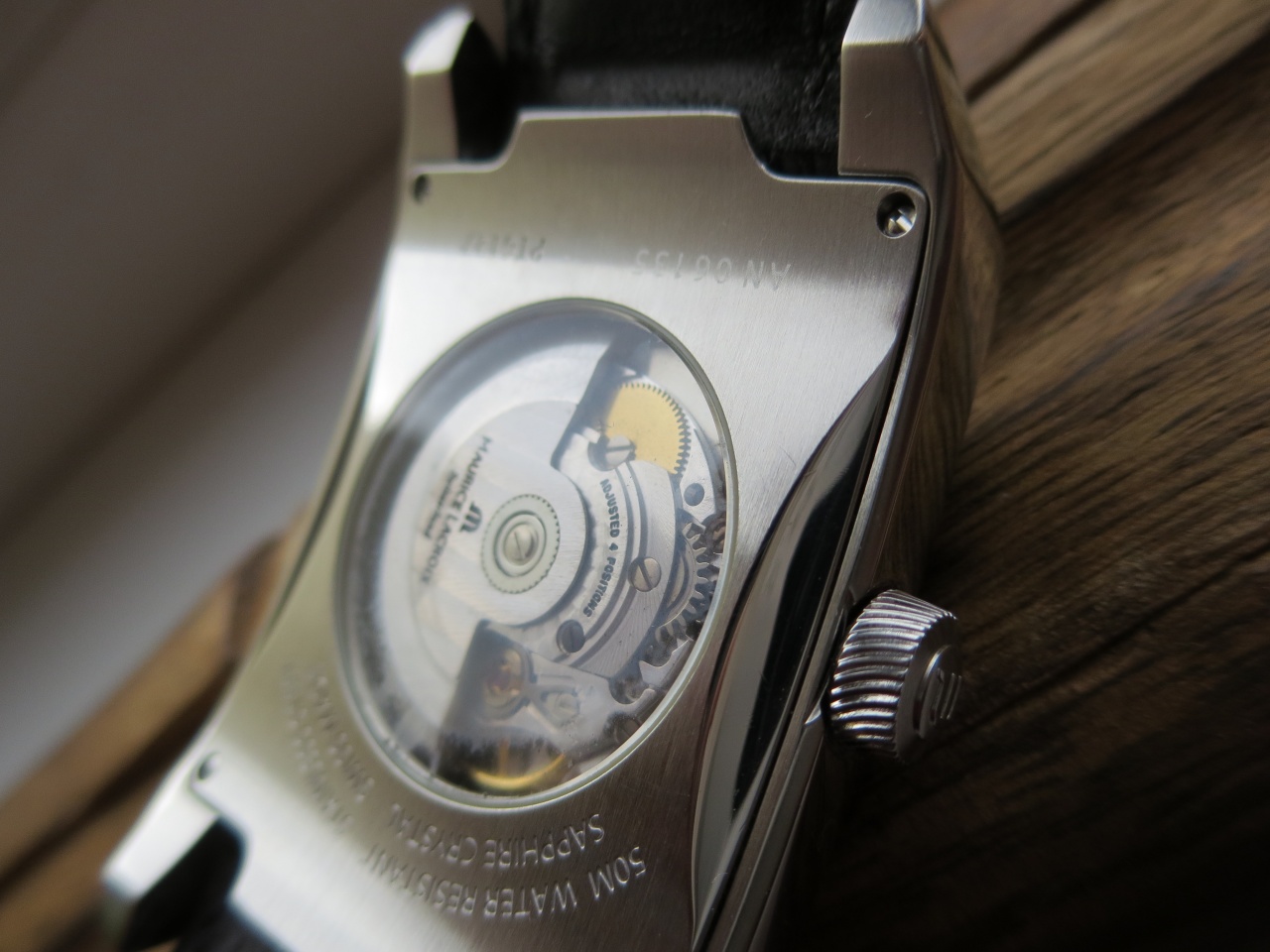 Согнутый по руке корпус, широкий ремень, сапфир, прозрачная задняя крышка и великолепно декорированный механизм.