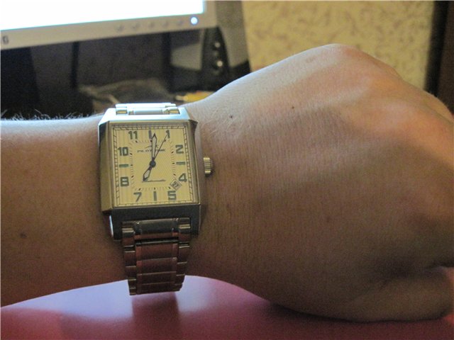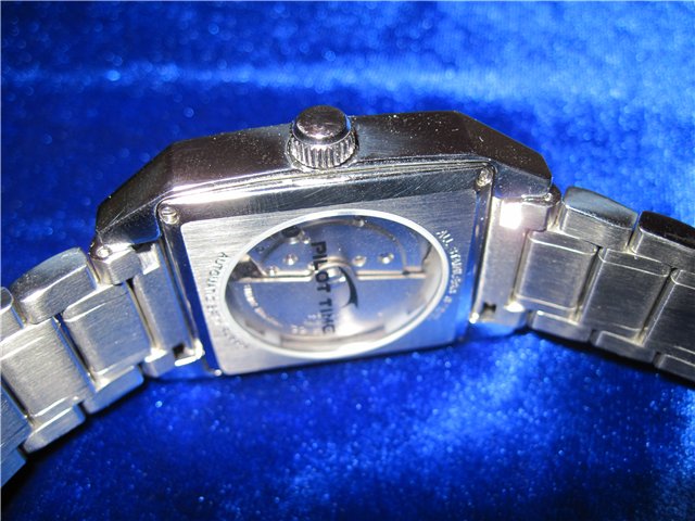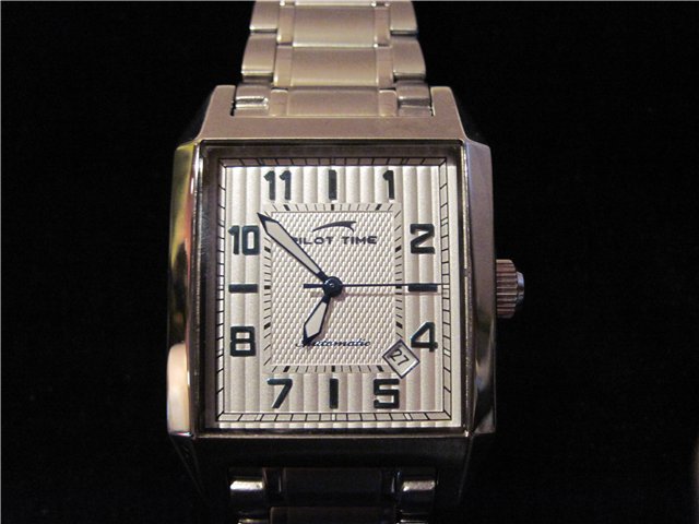 Прогуливаясь сегодня по городу вдруг совершенно случайно оказался у магазина "Русские часы" Повода туда зайти не было, левую руку приятно оттягивал недавно купленный там же Восток Амфибия, на правой руке громко тикали только что купленные на выставке "Коллекционер 2010" Кировки. Нужен был повод, и он нашёлся - ведь у меня нету ни одних квадратных часов. И вот я обладатель Pilot Time автомат с мийотовским механизмом за 4160 руб. Очень мне циферблат с синими цифрами и стрелками понравился. Весу они не малого, по ощущению немного больше 100гр. Довольно массивные. Надеюсь будут радовать.