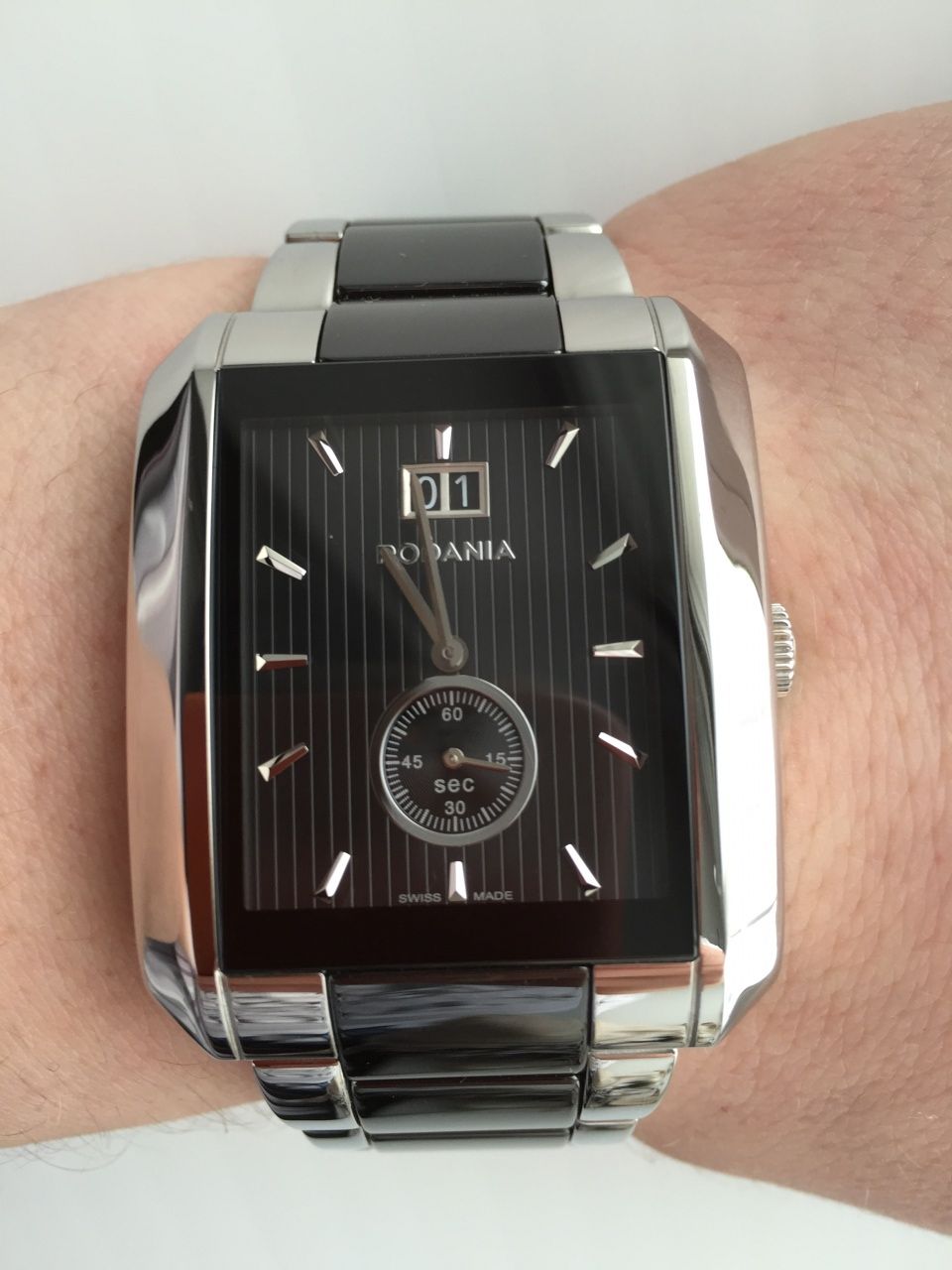 Точный кварцевый механизм RONDA калибр 6004 (Mastertech. На 4 камнях.). Смещенная секундная стрелка. Апертура даты. Срок службы батареи 43 месяца. • Функция EOL - индикация низкого уровня заряда батареи. • Элемент питания No 373. • Точность хода не хуже -10 +20 сек./в месяц. • Сапфировое стекло устойчивое к царапанию. • Корпус из высококачественного стального сплава 316L с высокими антикоррозийными свойствами. • Размеры корпуса 38 мм (по оси заводной головки) х 48 мм (по вертикали). • Водозащита до 5 АТМ. • Регулируемый по длине браслет из нержавеющей стали с керамическими вставками.