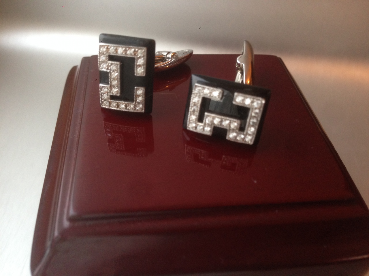 Запонки из белого золота 750 с ониксом и бриллиантами