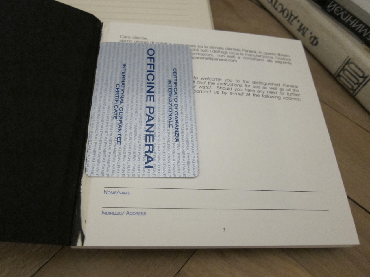 Часы с коробкой и документами. Год выпуска часов 2006. Часы покупались в америке. Документы - это книжка, в которой на первой странице указаны номера корпуса и артикул модели + дилер и дата продажи. В данном случае эта страница вырезана и вместо нее вклеена пустая гарантийная карта панерай. В принципе это не так важно в сегодняшние дни, потому что: