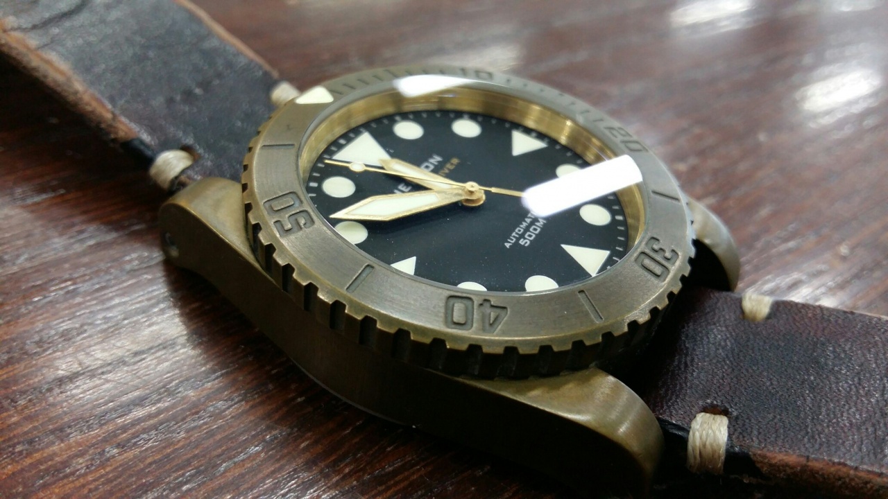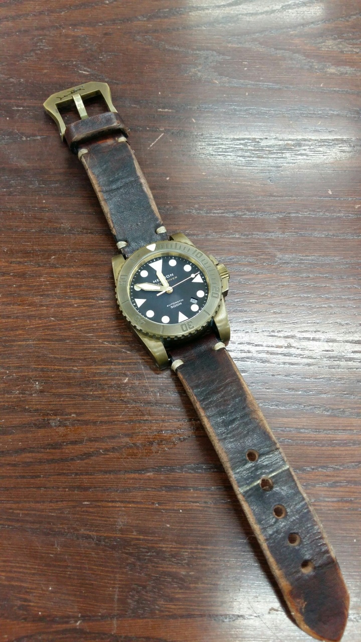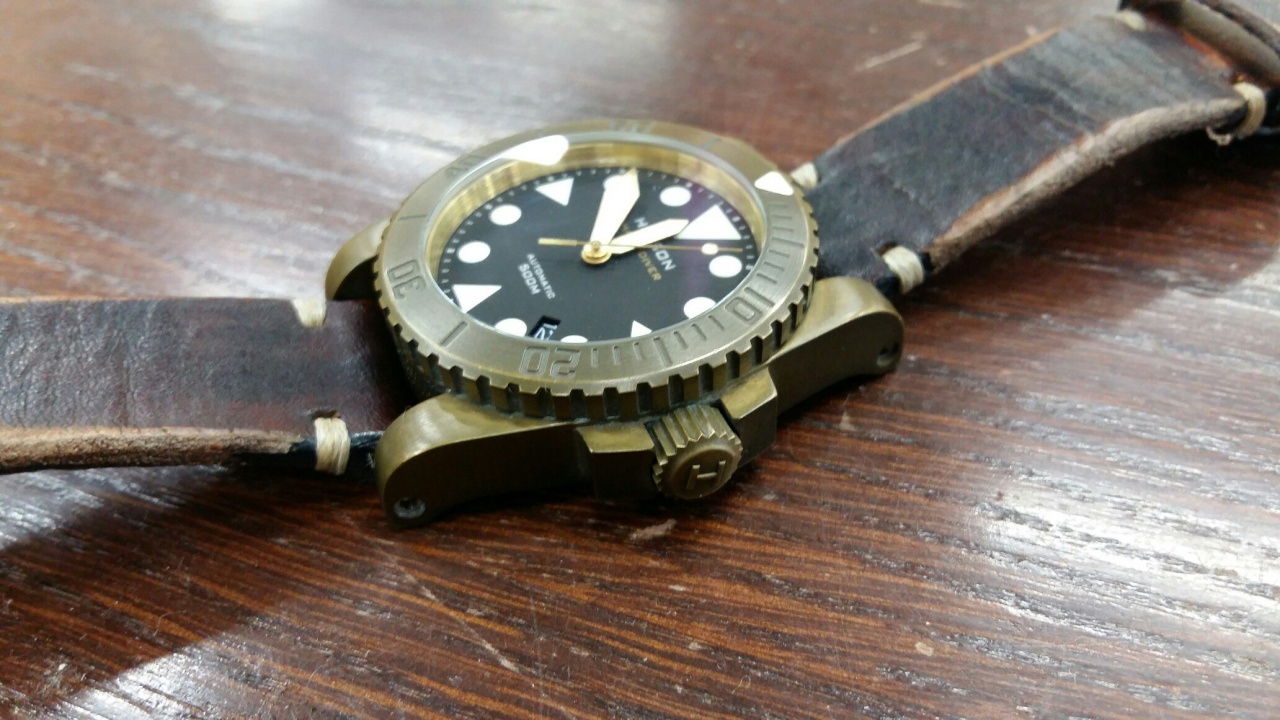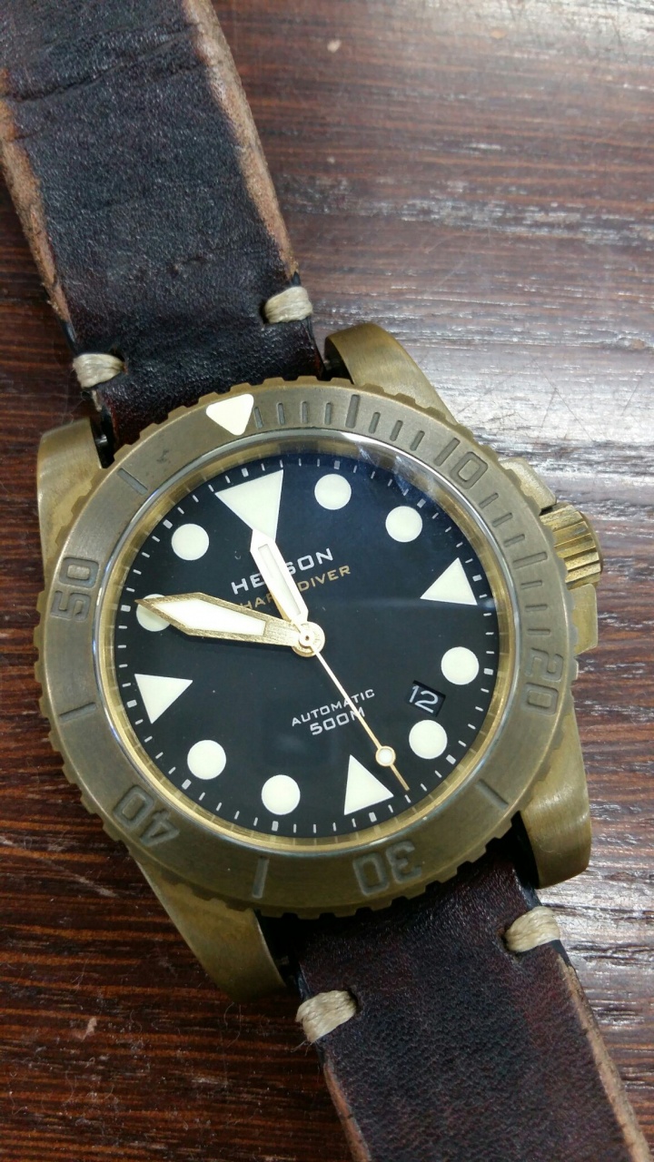 Helson Shark Diver, Латунный корпус, задняя крышка - титан. Диаметр корпуса 42мм, толщина 14.5 Приобретались в феврале 2016г. Полный комплект - коробка, документы, международная гарантия 1 год. Также в комплекте идет силиконовый ремень с фирменной баклей 20мм. Дополнительно приобретался винтажный ремень и бакля 22мм от Арунаса. Часы с патиной для создания нужного образа, при желании могу привести часы и баклю в первоначальный вид.