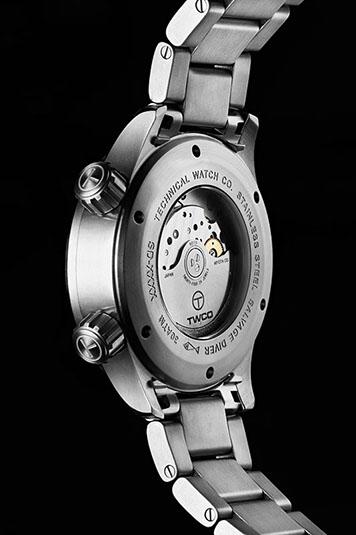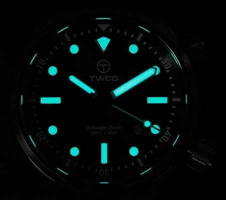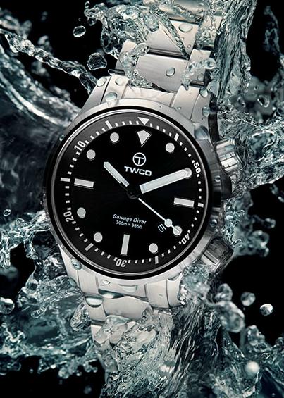 Новая дайверская модель Salvage Diver от голландской часовой компании TWCO имеет круглый сатинированный корпус, изготовленный из нержавеющей стали, диаметром 43,0 мм, толщиной 14,0 мм, с 22-миллиметровым расстоянием между ушками, водонепроницаемый до 300 метров. На торцах завинчивающихся рифленых заводной головки (расположенной на 4 часах), и головки (расположенной на 2 часах), посредством которой вращается внутреннее кольцо с дайверской разметкой, выгравированы логотипы бренда TWCO. Сапфировое стекло установлено на передней стороне часового корпуса (с антибликовым покрытием) и на его завинчивающейся задней крышке. Матово-черный циферблат с накладными часовыми индексами, покрытыми, как и стрелки, белым люминесцентным составом Superluminova, светящимся во тьме голубым цветом. Модель оснащена японским автоматическим механизмом Miyota 9015, на 24 камнях, с балансовой частотой 28800 полуколебаний в час (4 гц), 42-часовым запасом хода, функциями индикации часов, минут, секунд (посредством соответствующих центральных стрелок) и даты (посредством соответствующего цифрового указателя в апертуре, расположенной между 4 и 5 часами).