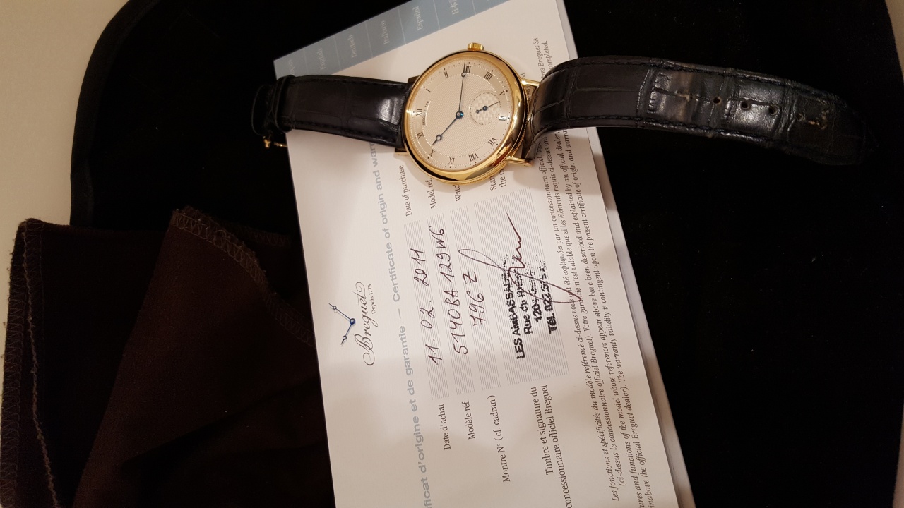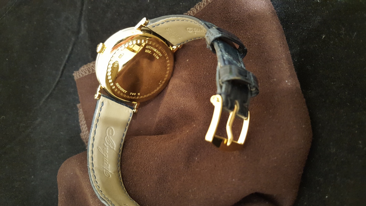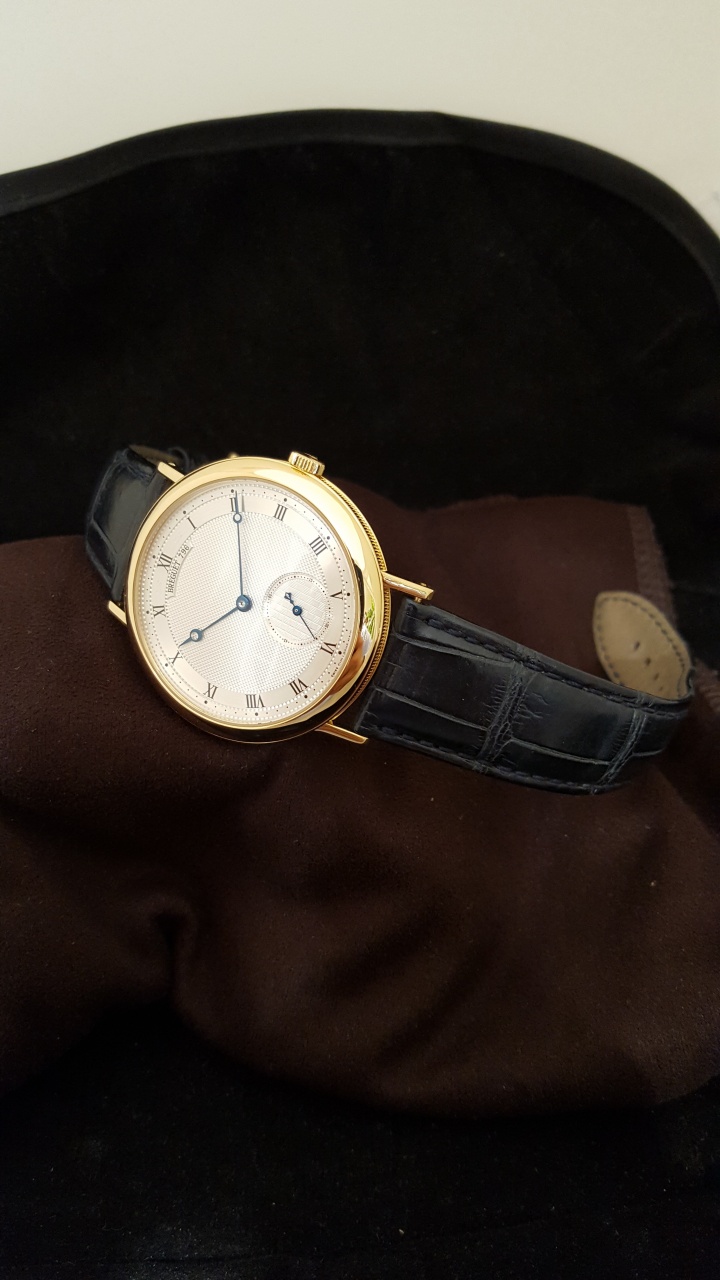 Breguet Classique 5140BA/12/9W6 Классические мужские часы в корпусе из желтого золота 18 карат на ремне из кожи аллигатора. Диаметр 40мм, толщина 10,8мм. Простая золотая застежка. Механические с автоподзаводом. Водонепроницаемость 30м. Запас хода до 46 часов. В хорошем состоянии после полировки, ремень оригинальный неновый. Документы.