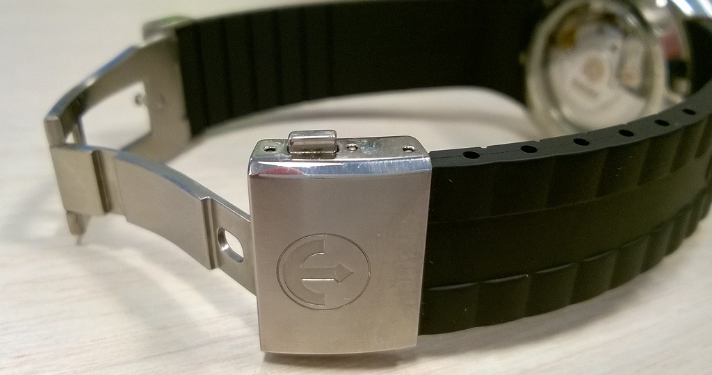 Итак, чёрный цифер, чёрный керамический безель, на чёрном же резиновом ремне. Качество каучука потрясающее - толстый, но мягкий, а застёжка, сделанная из нержавеющей стали, радует чёткостью фиксации.