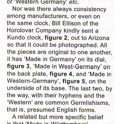 Практика показывает, что на часах, произведенных в период с 1949 по 1991 встречаются все возможные варианты: "Germany", "Made in Germany", "Made in W. Germany", "Made in West Germany", "West Germany" и тп и тд. Более того, бывают и такие курьезные случаи, что даже на одних и тех же часах можно встретить три совершенно разных варианта. И вот пример (фотки из статьи английского журнала Clocks, как раз посвященной этой теме). На циферблате одно, на механизме другое, а на подставке третье: