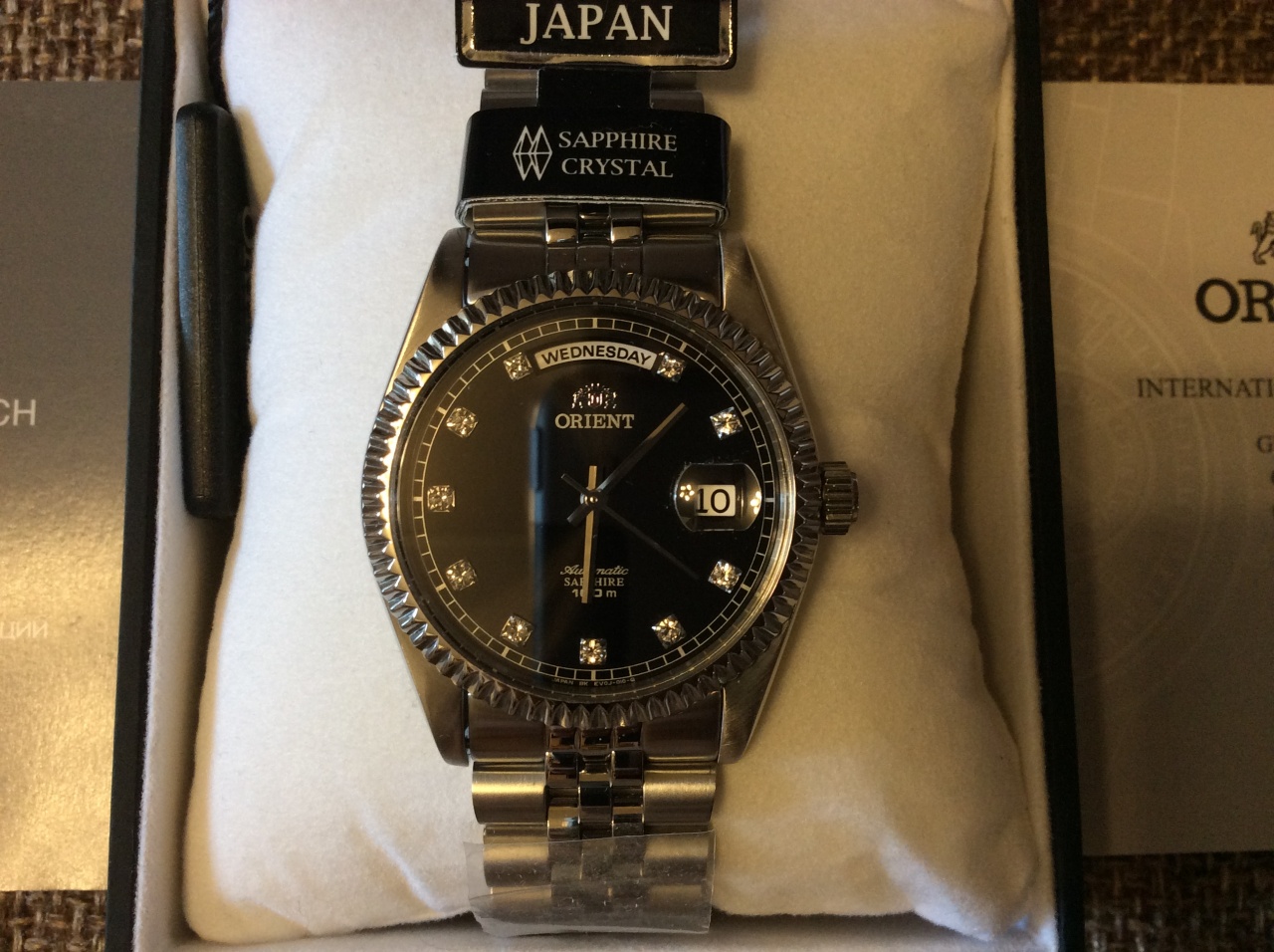 Механика-автомат без ручки, корпус и браслет нерж, диаметр 37мм, боковины и рифленый безель полированы, браслет юбилейный цельнолитой 20мм, полированные центральные звенья и торцы крайних, стекло и лупа сапфир, циферблат черный, водозащита 100м, завинчивающаяся заводная головка, Made In Japan.
