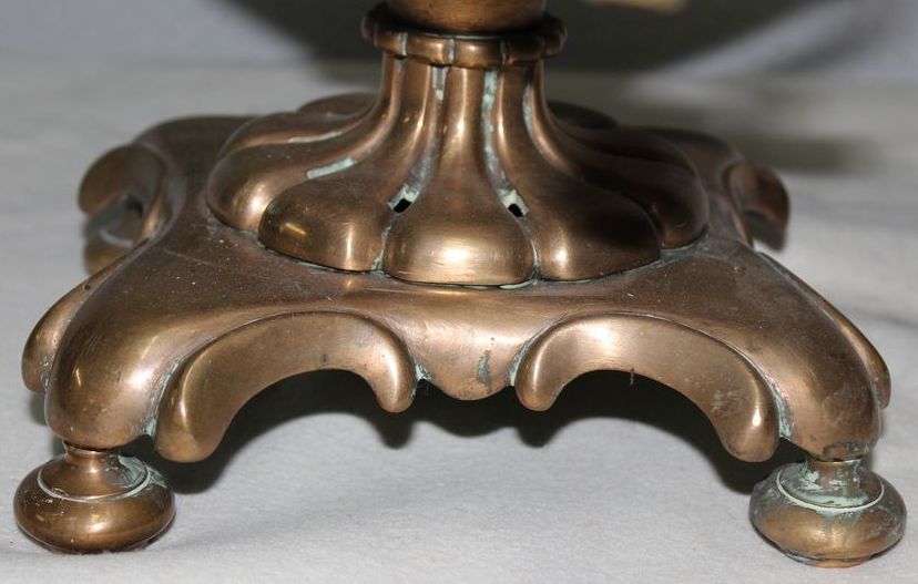 Тулово в форме вазы, стенка расчеканена овалами. Крышка ступенчатая. Ручки составлены из парных, изогнутых кверху пластин с рельефным рисунком, соединены овальной рельефной накладкой. Репеек круглый, стилизован под розетку цветка. Стебло крана гранное, с крюковидным выступом у носика. Шейка глухая, на круглом ступенчатом основании, с кольцевидным выступом в верхней части. Ножки фигурные, прикреплены к поддону с помощью фигурной рельефной накладки.