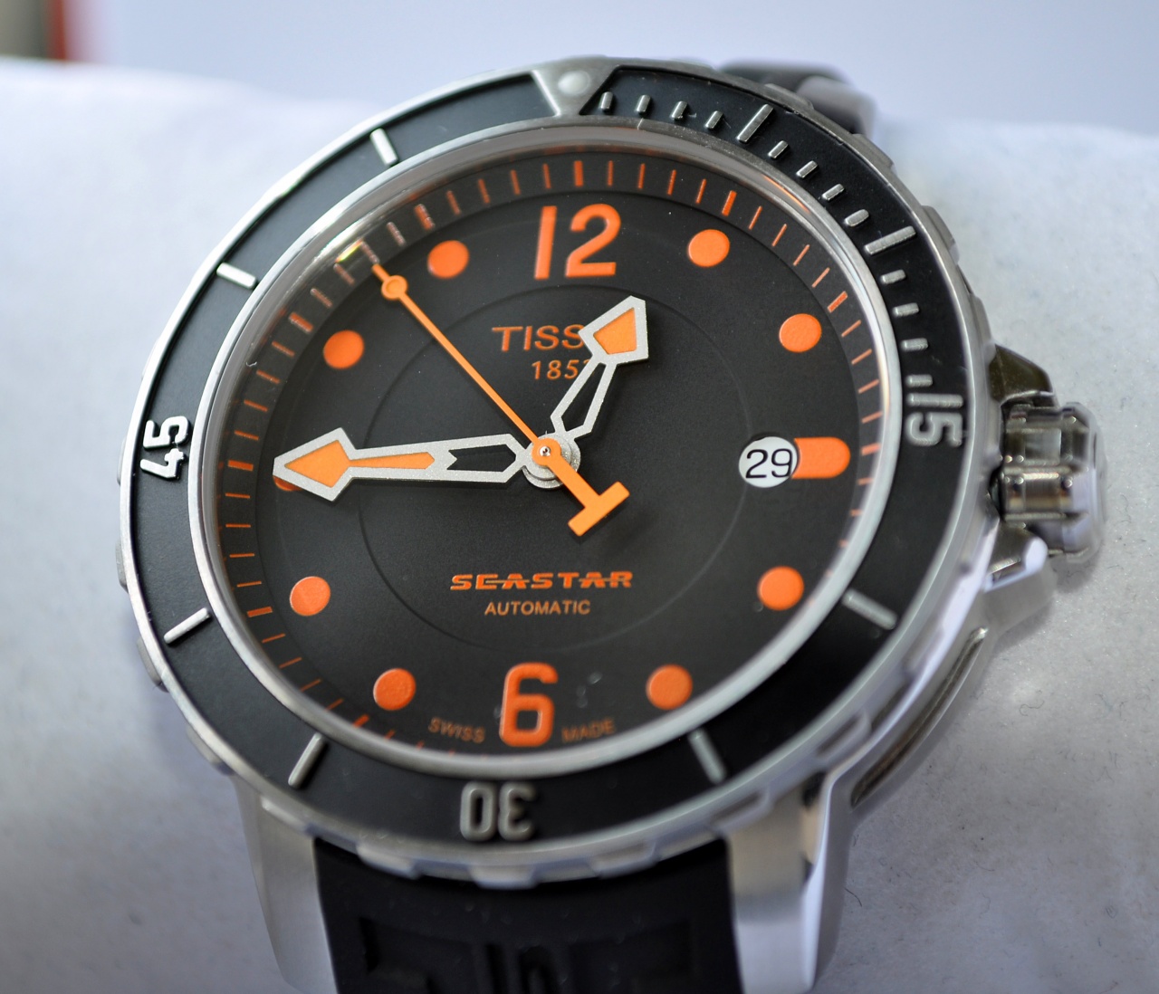 TISSOT T066.407.17.057.01 T-Sport Seastar 1000 - мужские механические часы. Корпус этих часов среднего размера (42 мм) и выполнен из нержавеющей стали. Модель TISSOT T066.407.17.057.01 T-Sport Seastar 1000 имеет сапфировое стекло, ремешок из натурального каучука черного цвета, черный циферблат с оранжевыми цифрами и окном календаря. Калибр механизма с автоподзаводом: ETA 2824-2. Класс водозащиты 300 м.