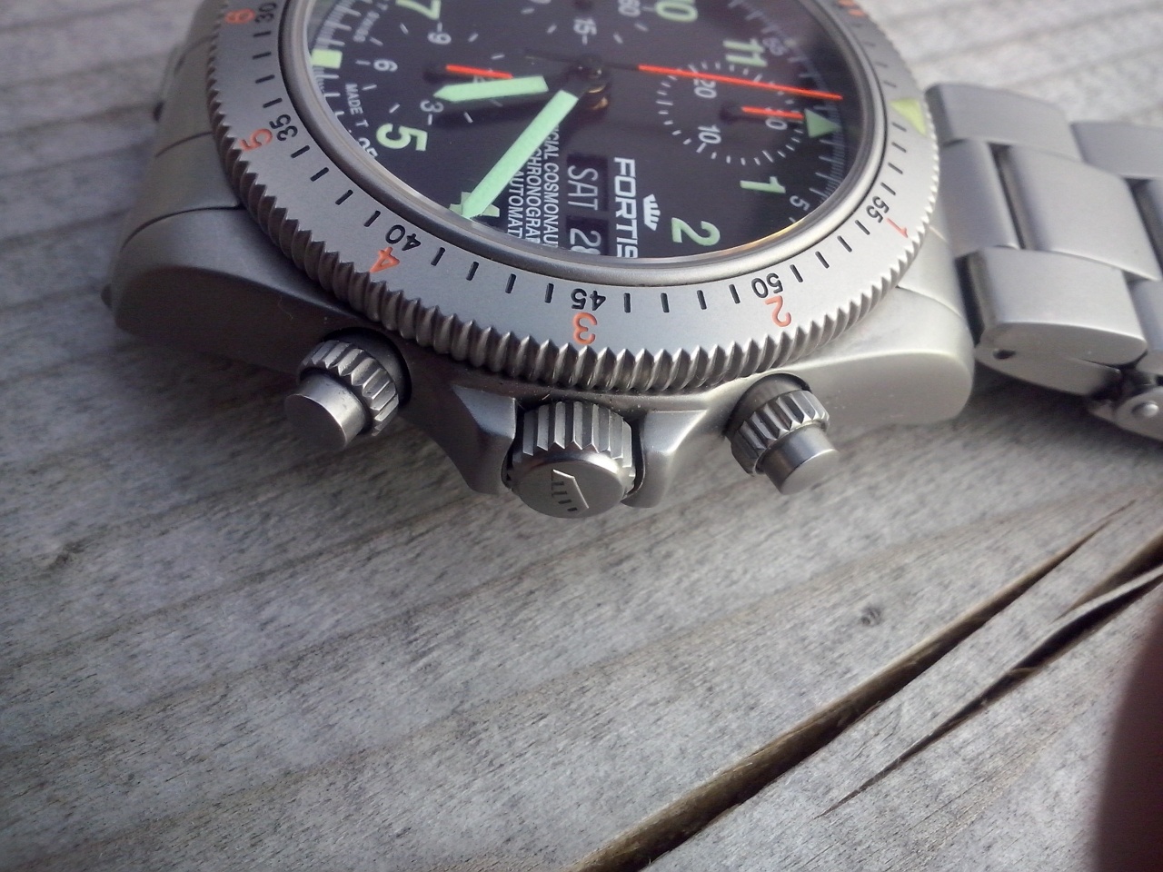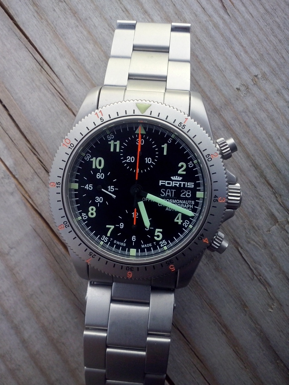 Продаю в Москве замечательный механический хронограф (Вальжу 7750) Fortis, На задней крышке символика Центра подготовки космонавтов РФ, Часы выполнены из брашированной стали , Диаметр 40мм, Число, день недели, двойной антиблик (эффект отсутствия стекла). Яркая светомасса на стрелках.
